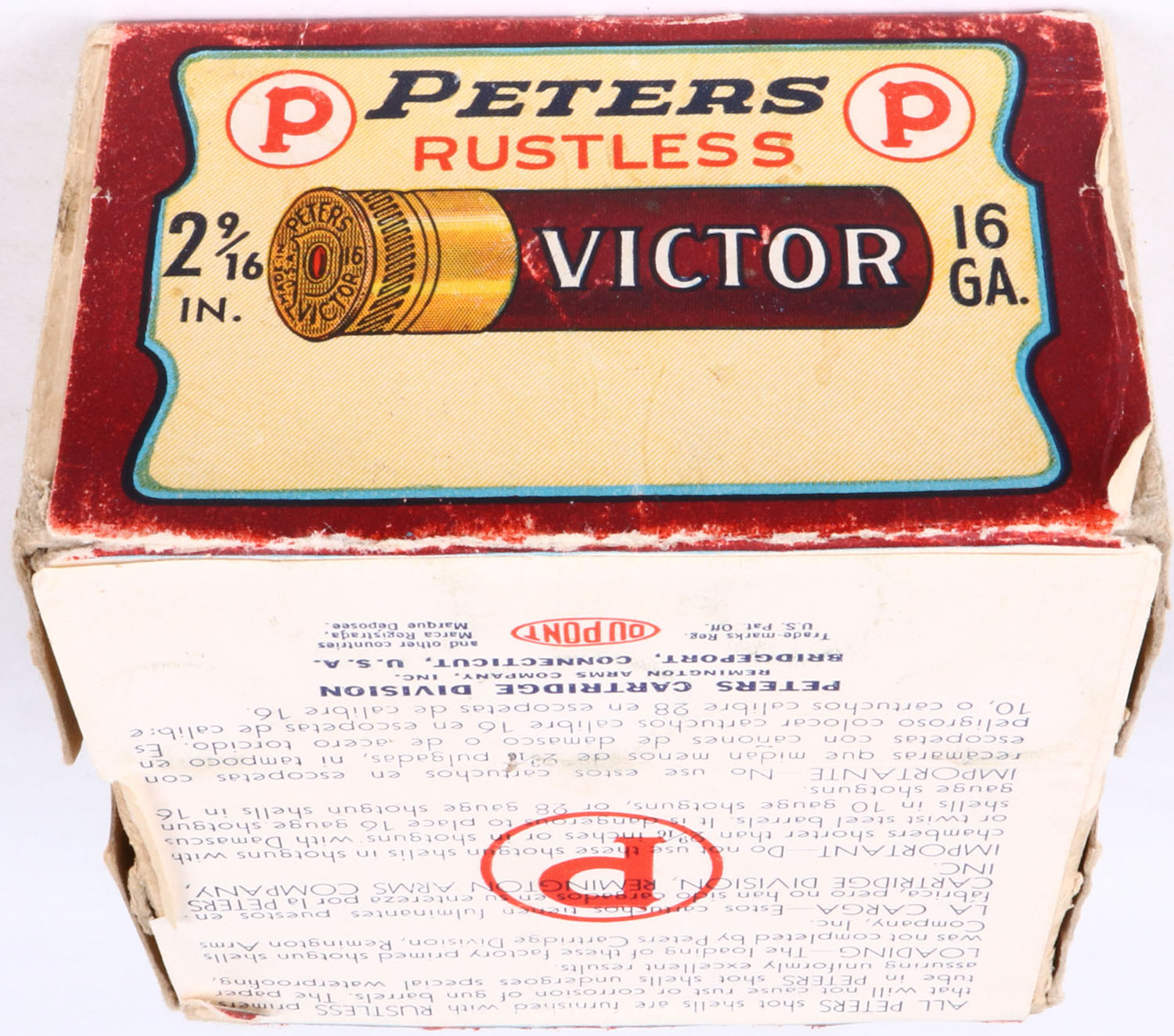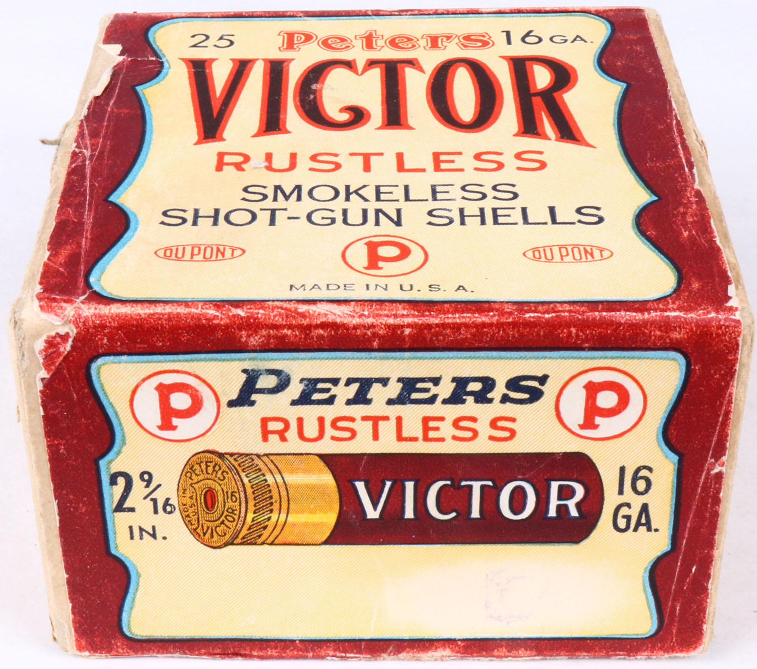 Peters Cart. Co., Victor, Rustless with Acrylic Box, 16Ga., 2 9/16'', 2pc., FULL & SEALED, shot size Unknown, buff box with brown, cream & black label, box is solid with a very good label has shell protrusions. Grade: Excellent - Value: 100 to 400