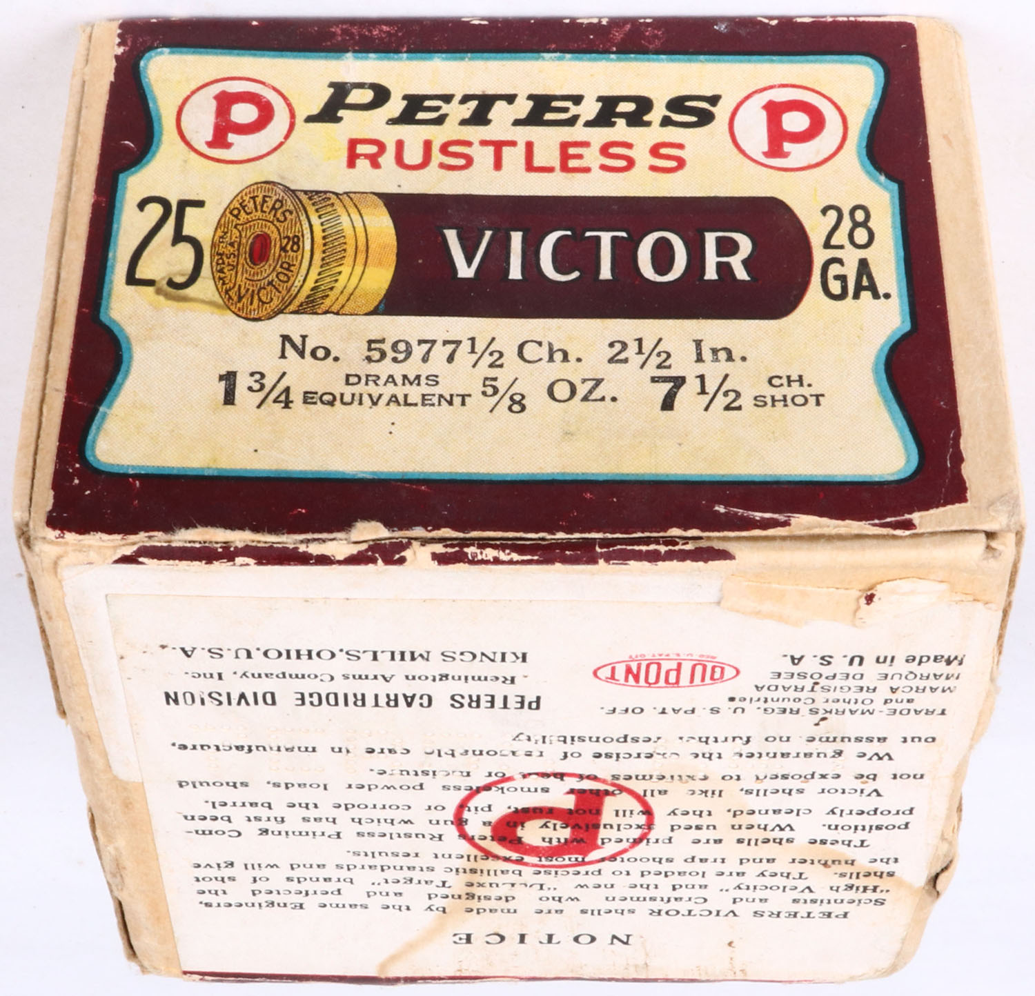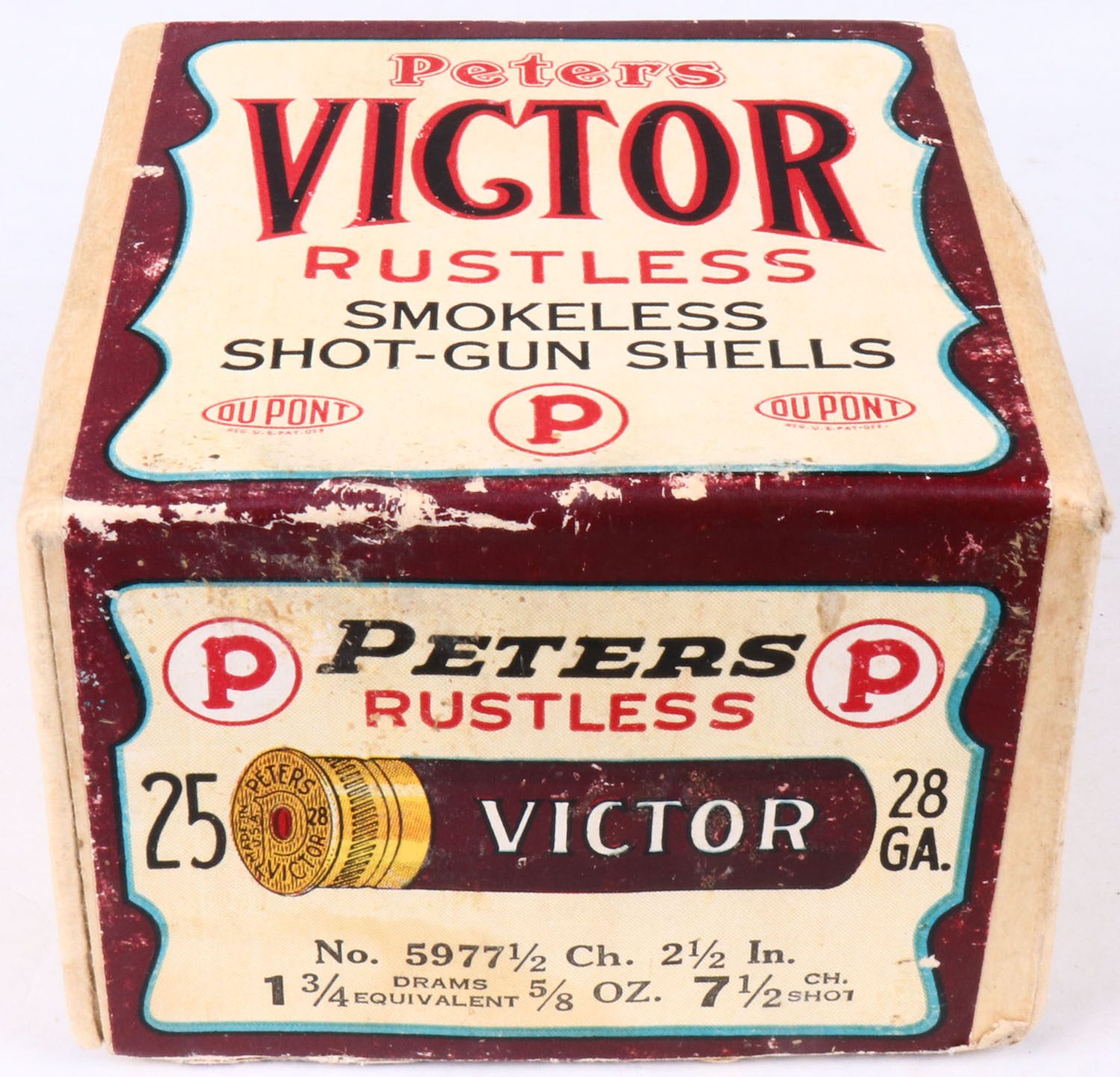 Peters Cart. Co., Victor, Rustless with insert, 28ga., 2pc., Full, shot size 7 1/2CH, 2 1/2'', buff box with brown, cream & black label, box is solid with great label and small shell protrusions, shells are mint. Grade: Excellent ++ - Value: 100 to 400