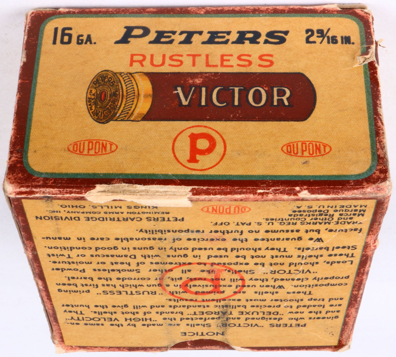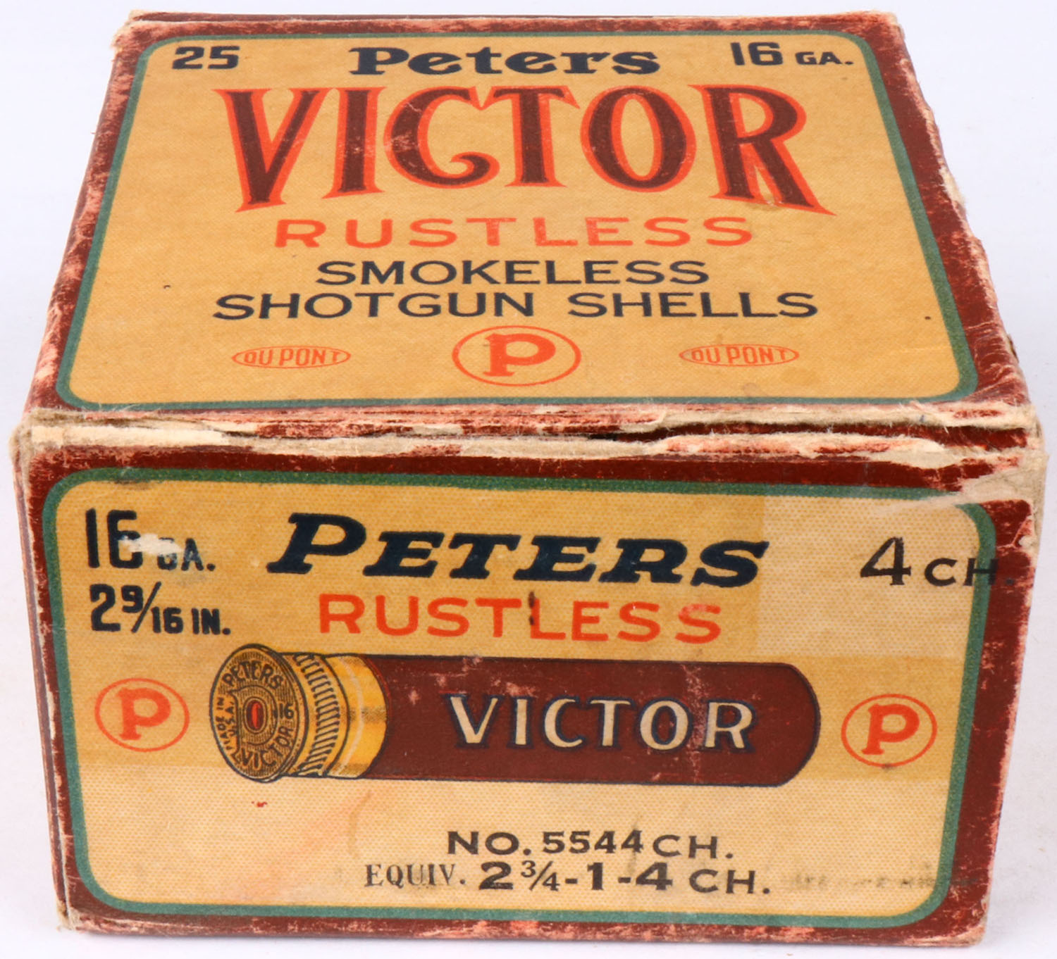 Peters, Victor, 16ga, 1pc., Full, shot size 4 CH, Maroon, cream & orange box, 2 9/16'', box has light edge wear, puncture on left side & bottom flap is disconnected, and has very nice colors, Shells are very good. Grade: Very Good ++ - Value: 50 to 80
