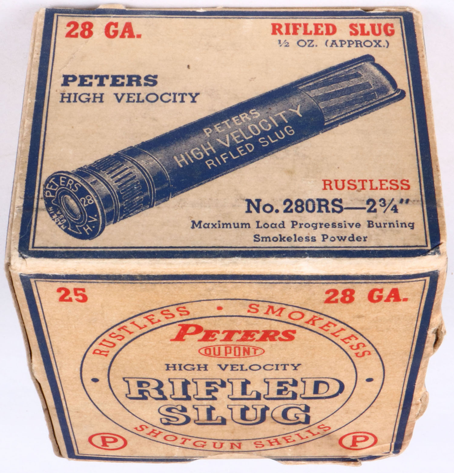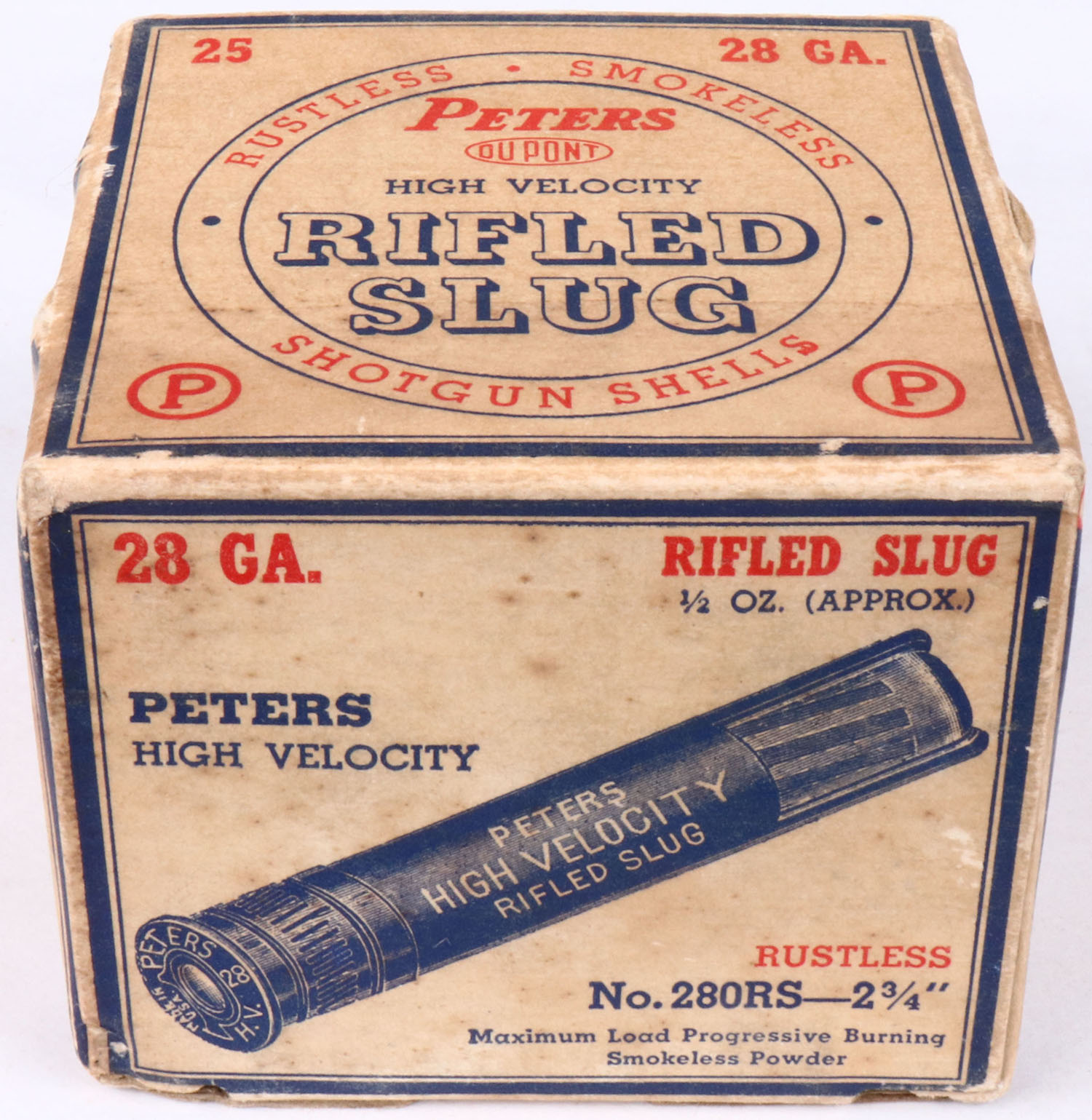 Peters Cart. Co., RIFLED SLUGS, 28 GAUGE, 2 3/4'', 1pc., Full, shot size Rifled Slug, multi colored box, box is very solid with great colors, box has light soiling & shell protrusions, shells are good. Grade: Very Good ++ - Value: 40 to 120