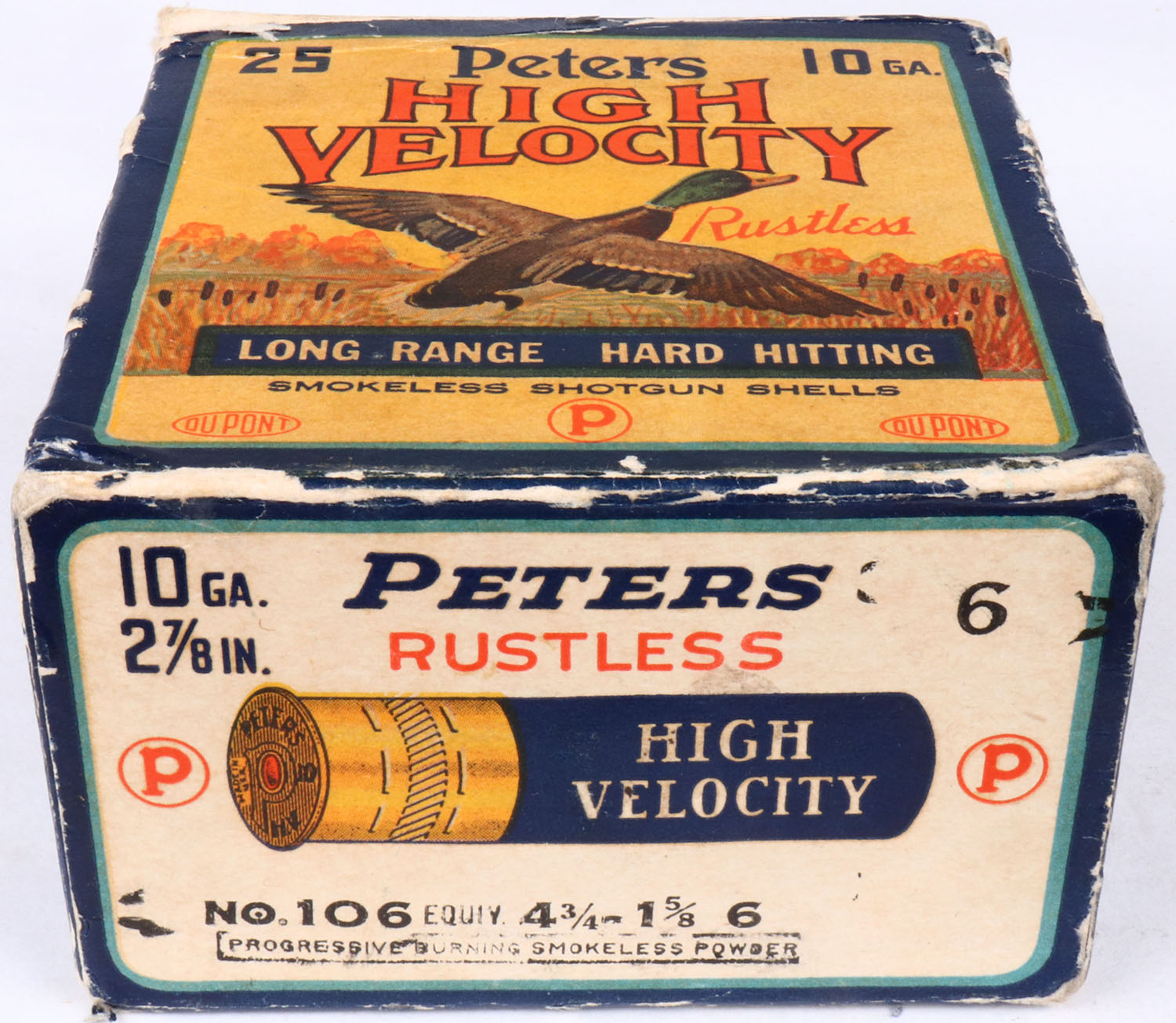 Peters Cart. Co., Kings Mills, OH, High Velocity, 10ga., 1pc., Full, shot size 6, multi colored box that pictures mallard flying out of the marsh grass, box is solid with edge wear, seam splits & bottom flap is almost disconnected, box has very nice colors, shells are excellent. Grade: Excellent - Value: 40 to 100