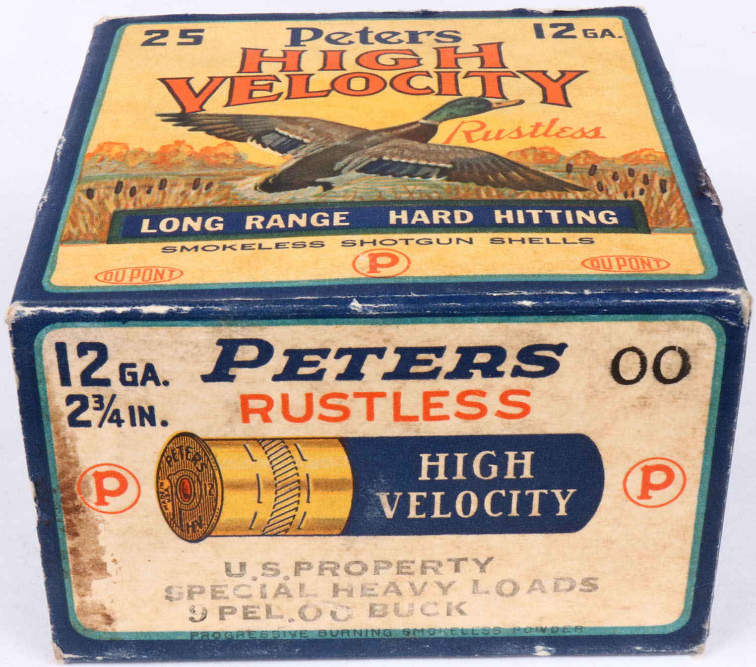 Peters Cart. Co., Kings Mills, OH, High Velocity U.S. Property, 12ga., 1pc., Full, shot size 00 Buck, multi colored box that pictures mallard flying out of the marsh grass, box is very solid with great colors, box has light edge wear & light soiling, shells are excellent. Grade: Excellent + - Value: 20 to 80