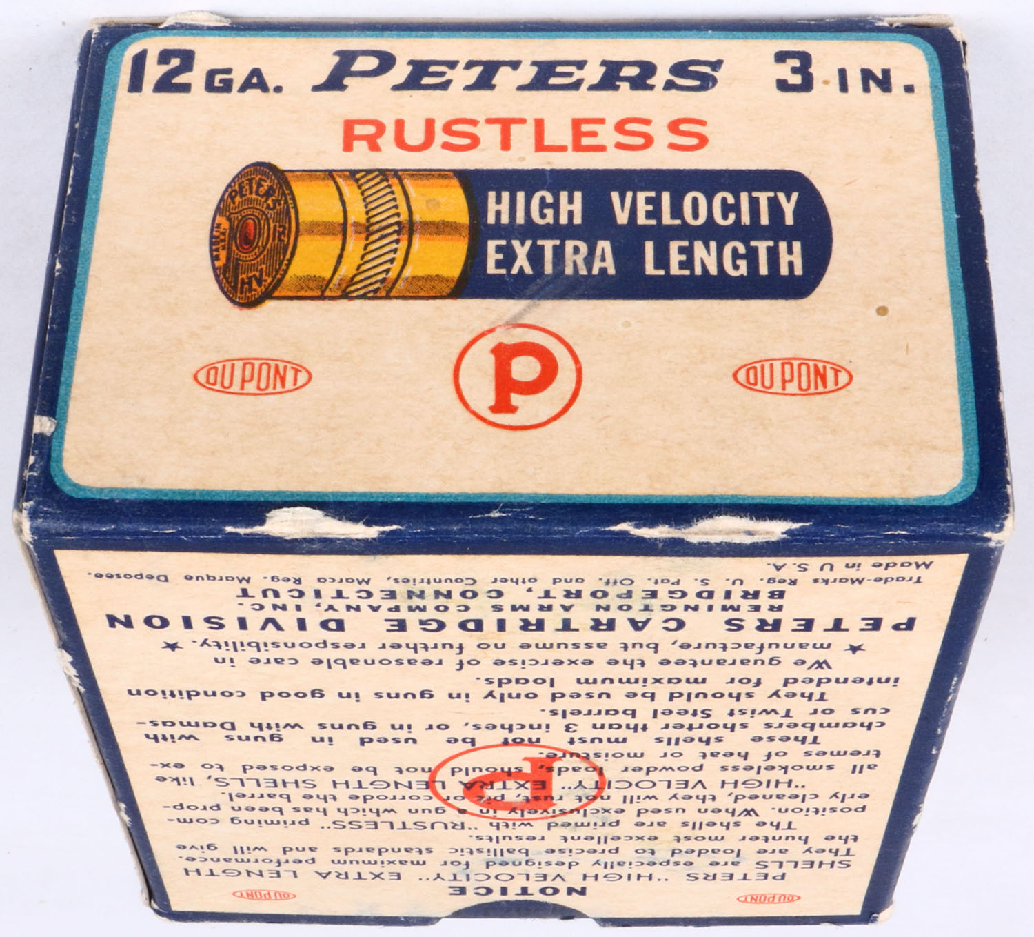 Peters Cart. Co., Bridgeport, CT, High Velocity Extra Length, 12ga., 1pc., Full, 3'', shot size BB, multi colored box that pictures mallard flying out of the marsh grass, box is very solid with great colors & light edge wear, shells are excellent. Grade: Excellent + - Value: 20 to 80