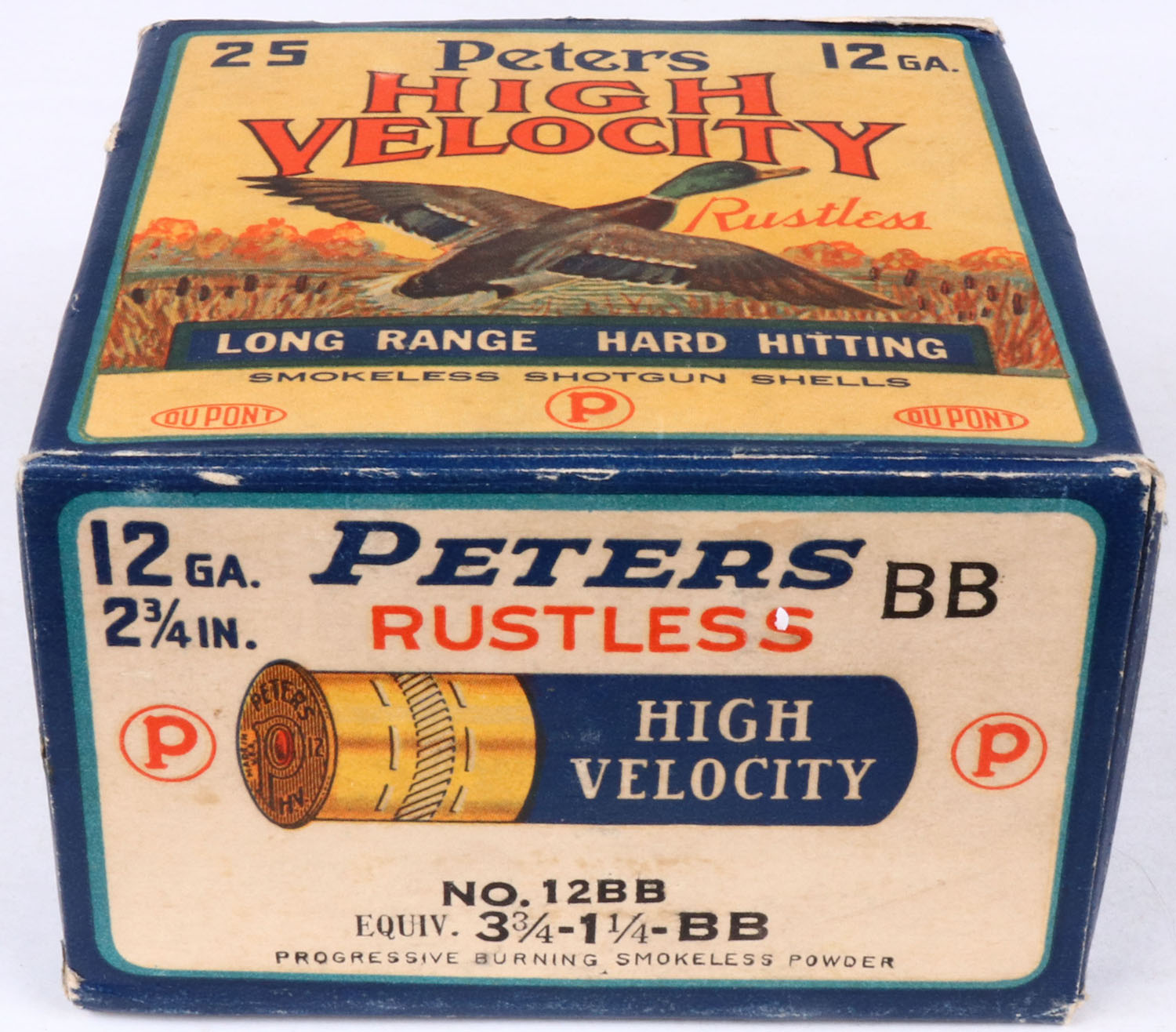 Peters Cart. Co., Kings Mills, OH, High Velocity, 12ga., 1pc., Full, shot size BB, multi colored box that pictures mallard flying out of the marsh grass, box is very solid with great colors, box has light edge wear, shells are excellent. Grade: Excellent + - Value: 20 to 80