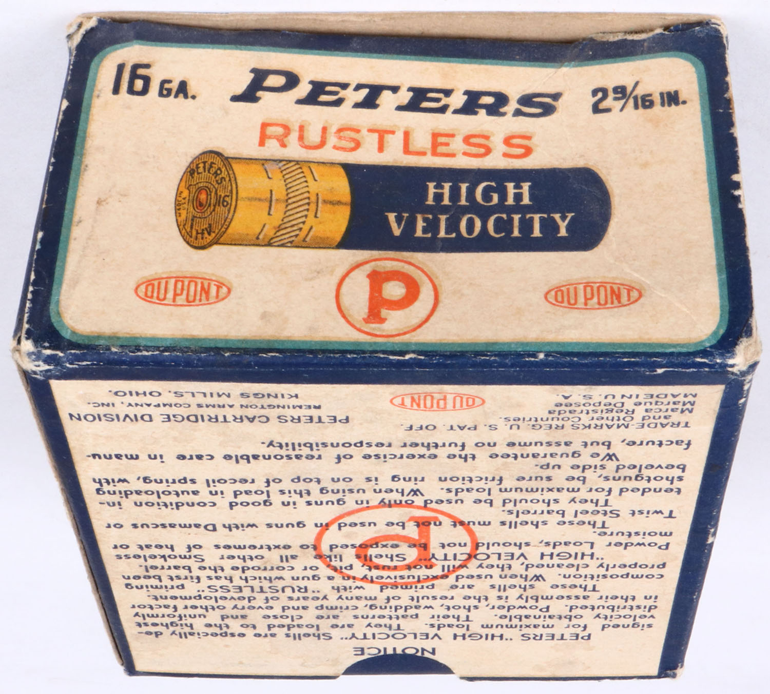 Peters Cart. Co., Kings Mills, OH, High Velocity, 16ga., 1pc., Empty, shot size 7 1/2CH, multi colored box that pictures mallard flying out of the marsh grass, box has light edge wear & light soiling, with very nice colors. Grade: Very Good ++ - Value: 10 to 40