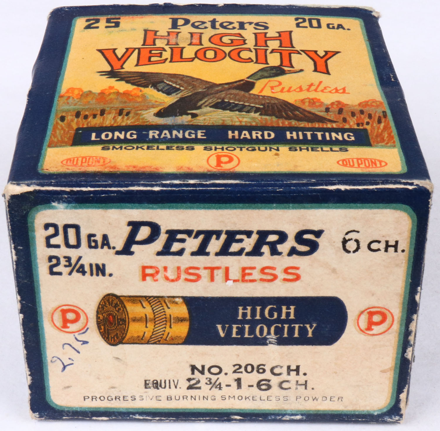 Peters Cart. Co., Kings Mills, OH, High Velocity, 20ga., 1pc., Partial 23rds, shot size 6 CH, multi colored box that pictures mallard flying out of the marsh grass, box is solid has light edge wear, light soiling with very nice colors, shells are excellent. Grade: Excellent - Value: 20 to 80