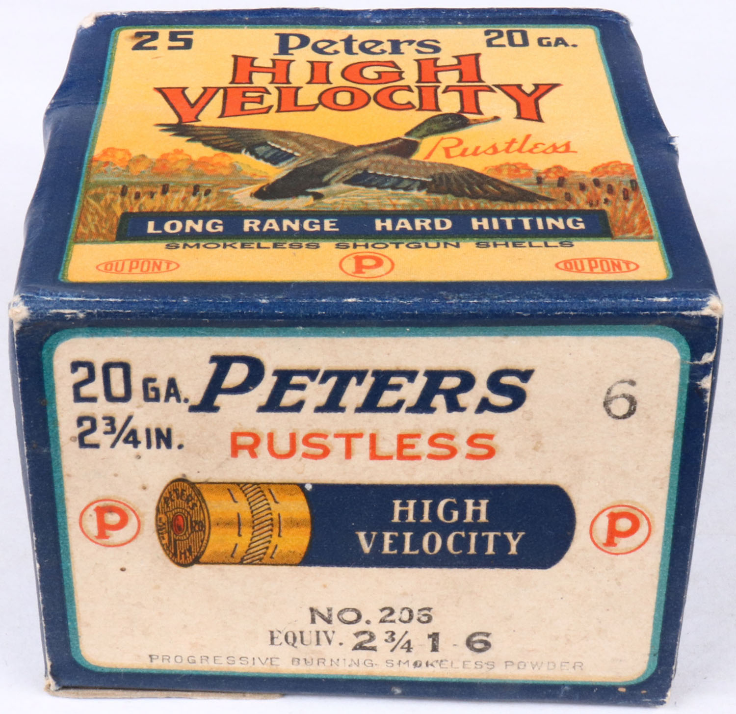 Peters Cart. Co., Kings Mills, OH, High Velocity, 20ga., 1pc., Full, shot size 6, multi colored box that pictures mallard flying out of the marsh grass, box is solid with light age soiling, shell protrusions, great color, shells are very good. Grade: Excellent - Value: 20 to 80