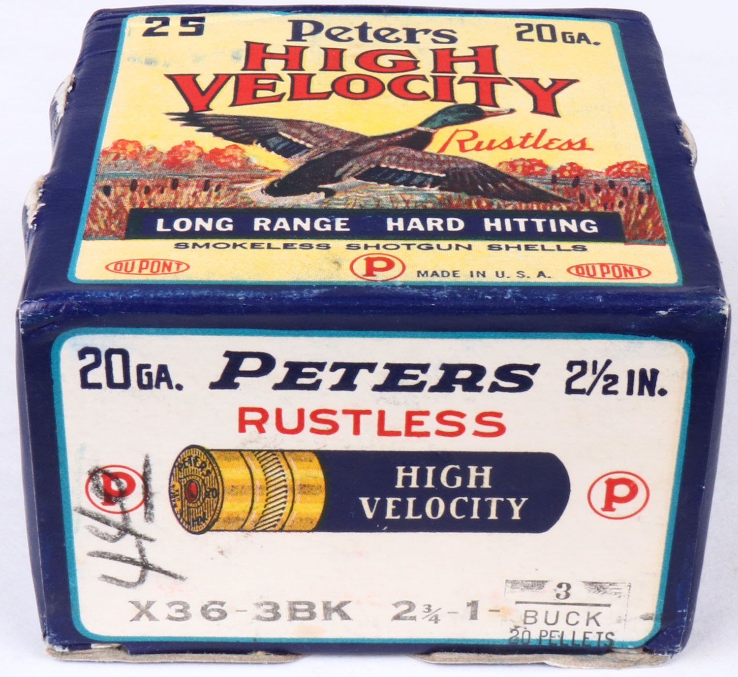 Peters Cart. Co., Bridgeport, CT, High Velocity, 20ga., 1pc., Full, shot size 3 BUCK, multi colored box that pictures mallard flying out of the marsh grass, box is solid with great colors some light shell protrusions, shells are excellent. Grade: Excellent + - Value: 20 to 80