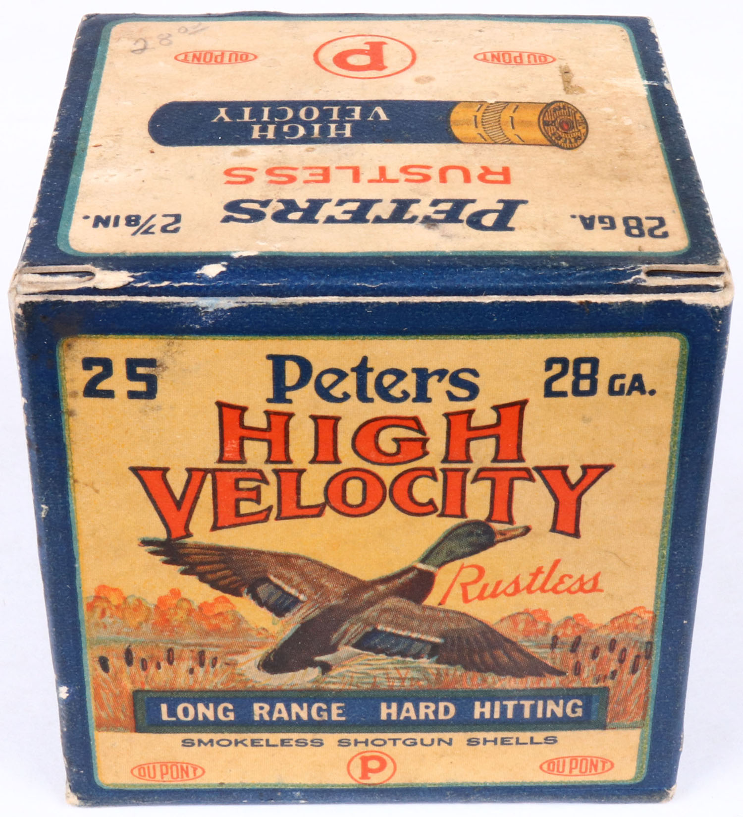 Peters Cart. Co., Kings Mills, OH, High Velocity, 28ga., 1pc., Full, shot size 6 CH, multi colored box that pictures mallard flying out of the marsh grass, box is solid with very nice colors, box has light age soiling & light edge wear, shells are very good. Grade: Excellent - Value: 20 to 80