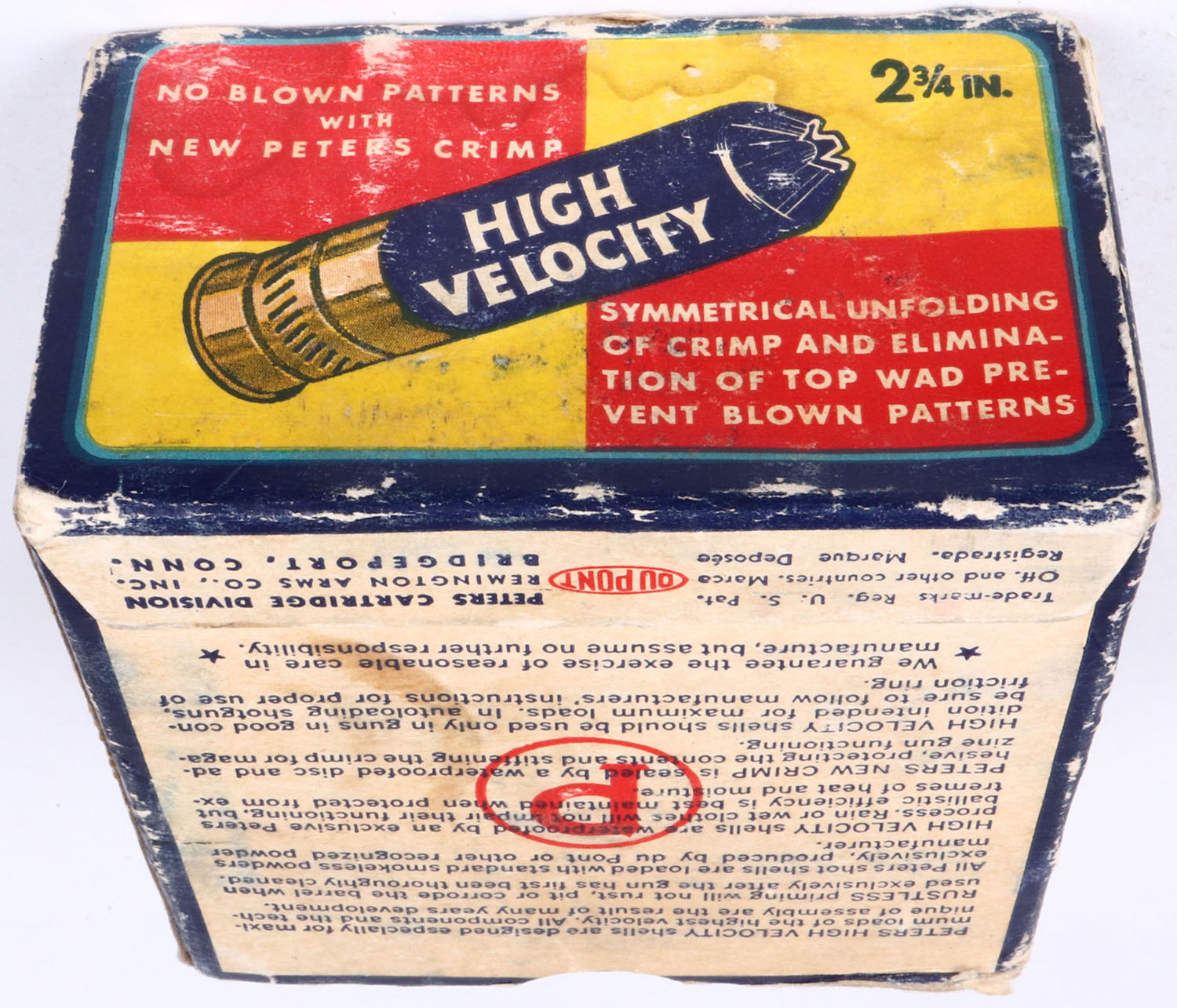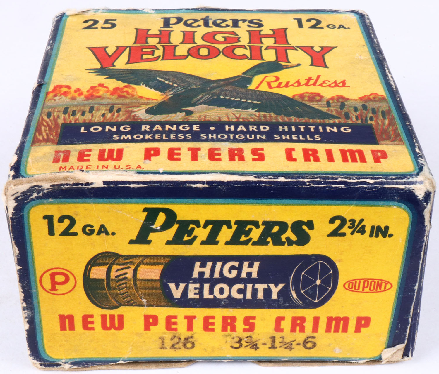 Peters Cart. Co., High Velocity, New Peters Crimp, 12ga., 1pc., Partial 18rds, shot size 6, multi colored box that pictures mallard flying out of the marsh grass, paper shells, box is solid with edge wear & soiling, shells are very good. Grade: Very Good ++ - Value: 10 to 60
