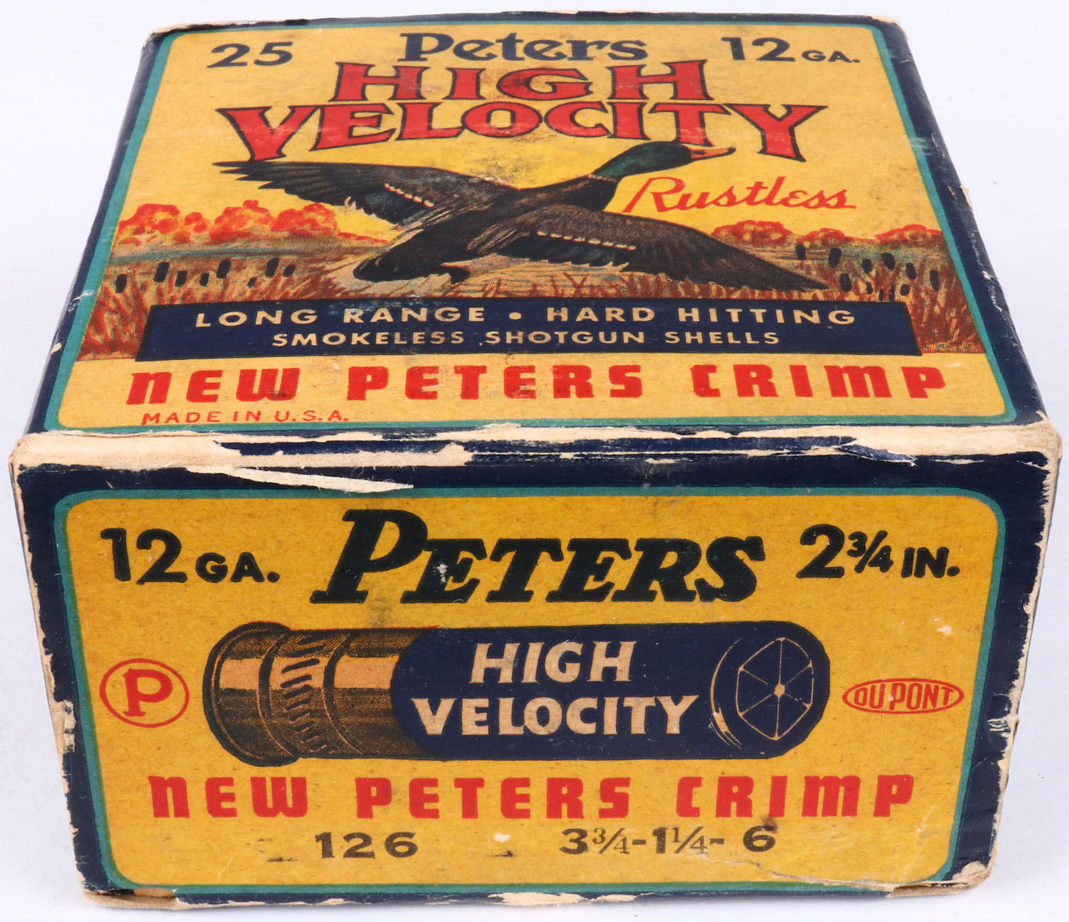 Peters Cart. Co., High Velocity, New Peters Crimp, 12ga., 1pc., Partial 15rds, shot size 6, multi colored box that pictures mallard flying out of the marsh grass, paper shells, box is solid with edge wear & light soiling, shells are excellent. Grade: Excellent - Value: 10 to 60