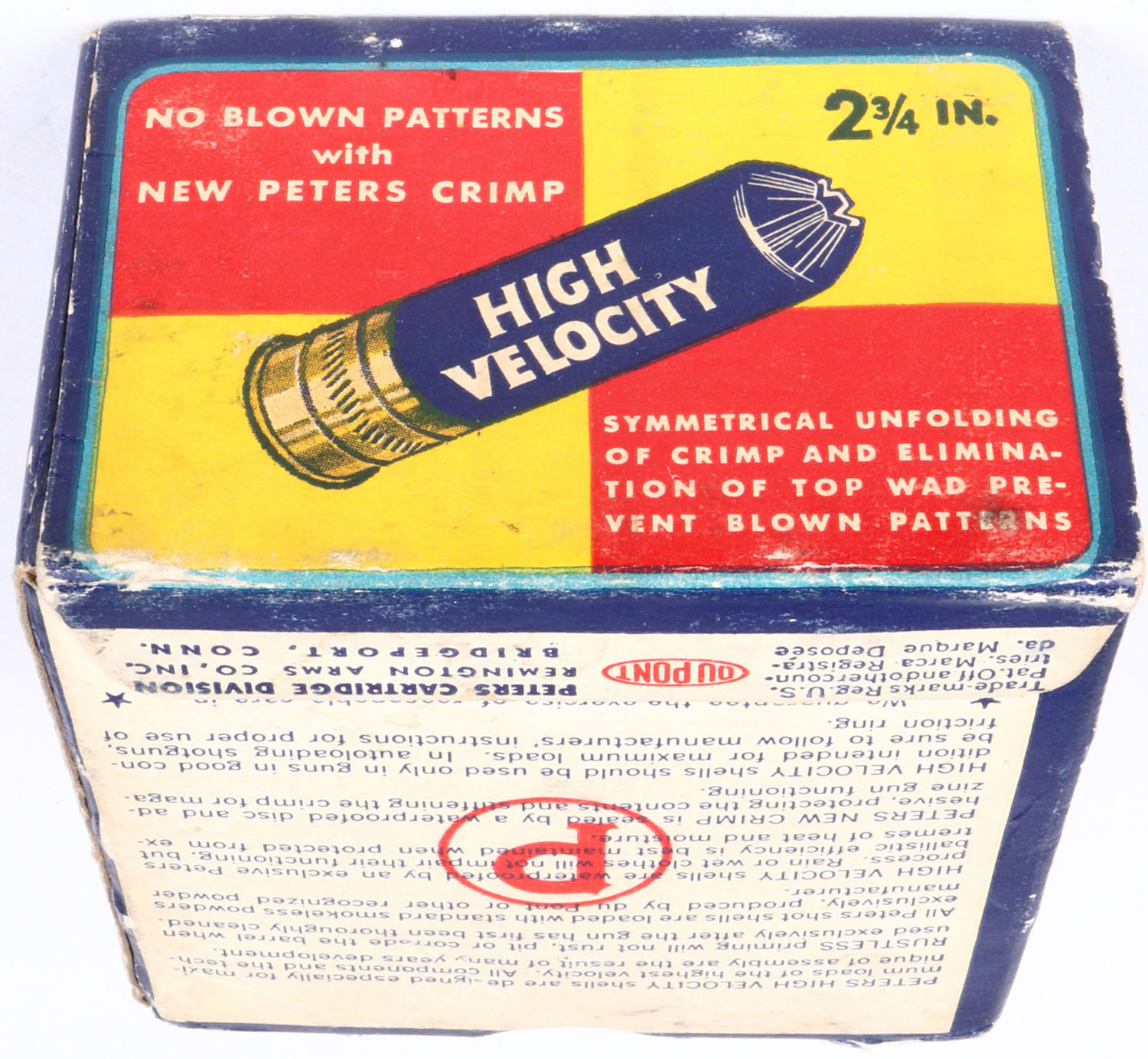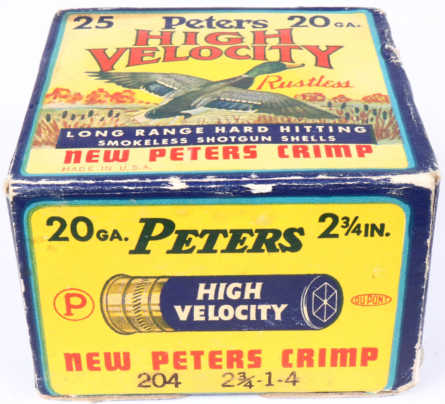 Peters Cart. Co., High Velocity, New Peters Crimp, 20ga., 1pc., Partial 24rds, shot size 4, multi colored box that pictures mallard flying out of the marsh grass, paper shells, box is solid with light edge wear, shells are excellent. Grade: Excellent + - Value: 20 to 80