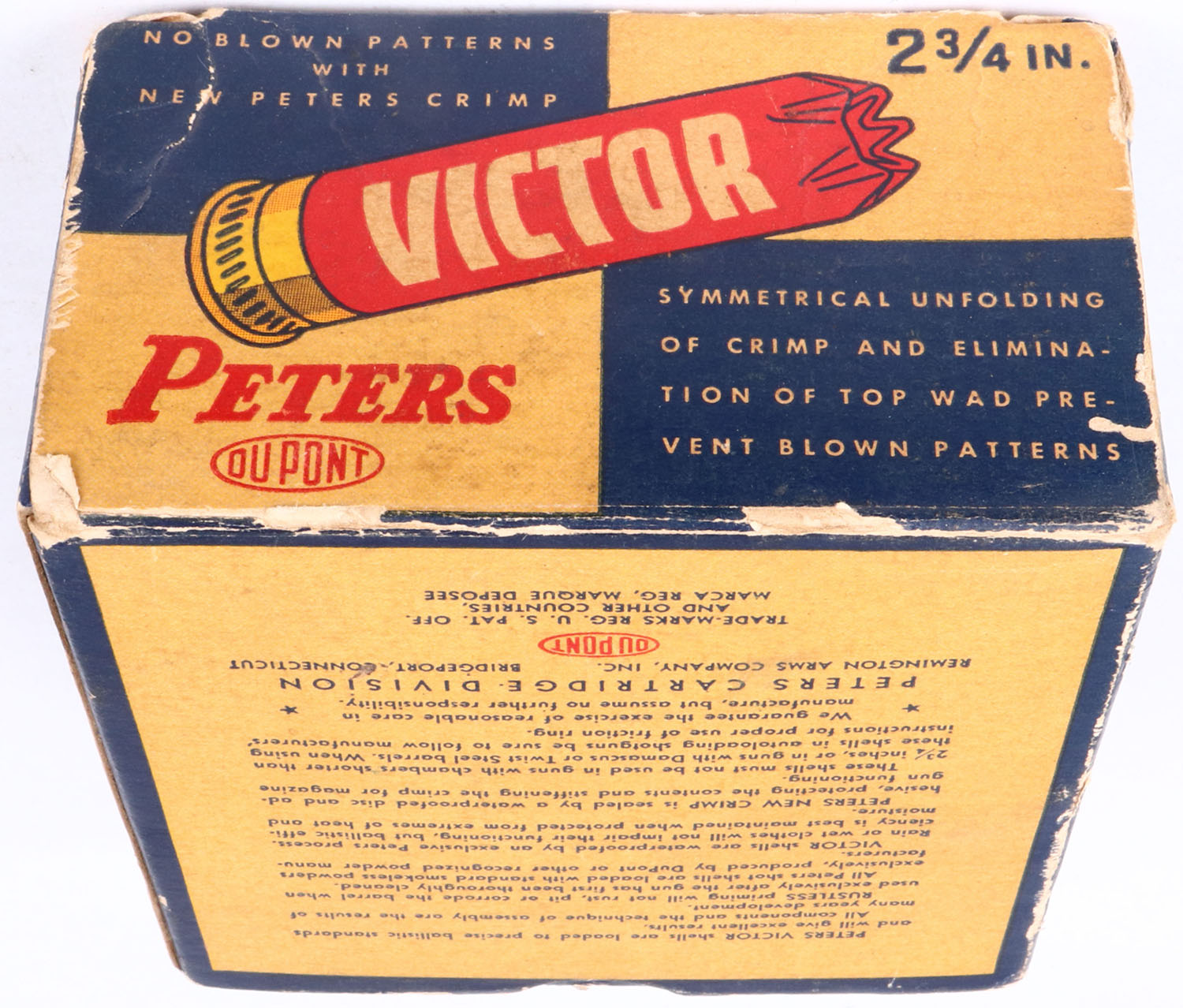Peters, VICTOR FIELD LOADS, 12ga., 1pc., Empty, shot size 6, blue, white & red box, box is solid with very nice color, box has light age soiling & light edge wear. Grade: Very Good ++ - Value: 8 to 30