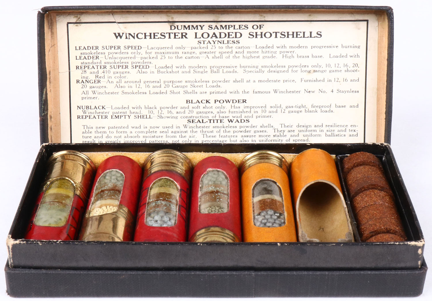 Winchester, Salesman Sample Shotshell box, 2pc., black box with yellow label with red & black print, box is marked Leader Super Speed, Repeater Super Speed, Leader, Ranger, Nublack, Repeater Empty Shell & Seal-Tite Wads, Full and correct with one Seal-Tite Wads Missing, Five Window shells are excellent with one cut-a-way shell, box has scuff on bottom but is solid with crisp label. Grade: Excellent ++ - Value: 200 to 500