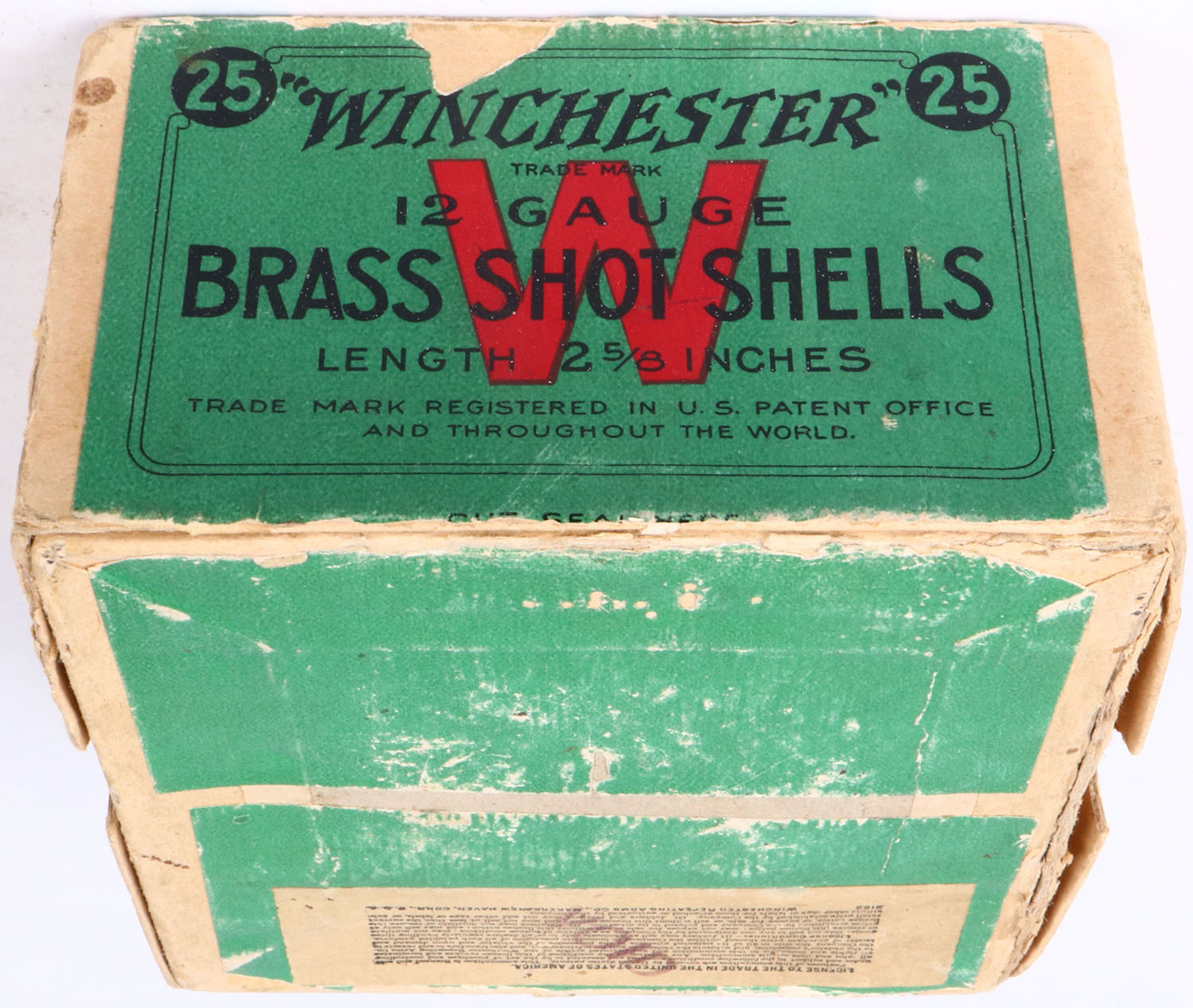 Winchester, BRASS SHOT SHELLS, 12ga., 2pc., Empty, 2 5/8'', buff box with green, red & black label, box has light edge wear & seam split, box is solid & has very nice colors to label. Grade: Excellent - Value: 50 to 200