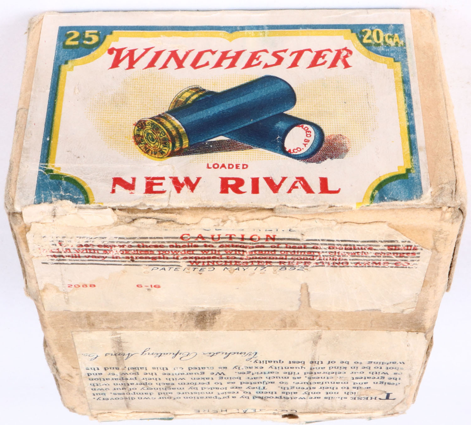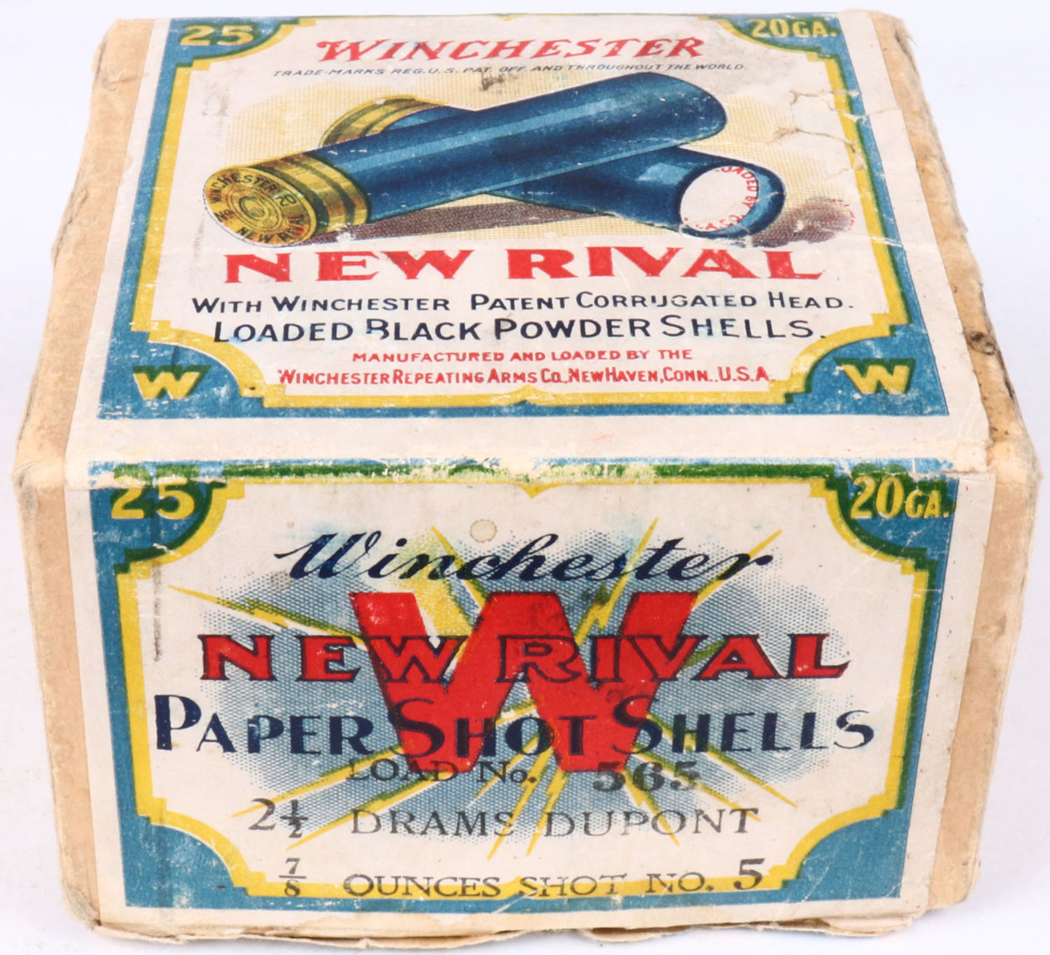 Winchester, NEW RIVAL, 20 GAUGE, 2pc., Empty, Shot Size 5, buff box with multi-colored label that pictures the two crossed shells, loaded BLACK POWDER shells, box has tape repaired seam split with very nice colors. Grade: Excellent - Value: 50 to 200
