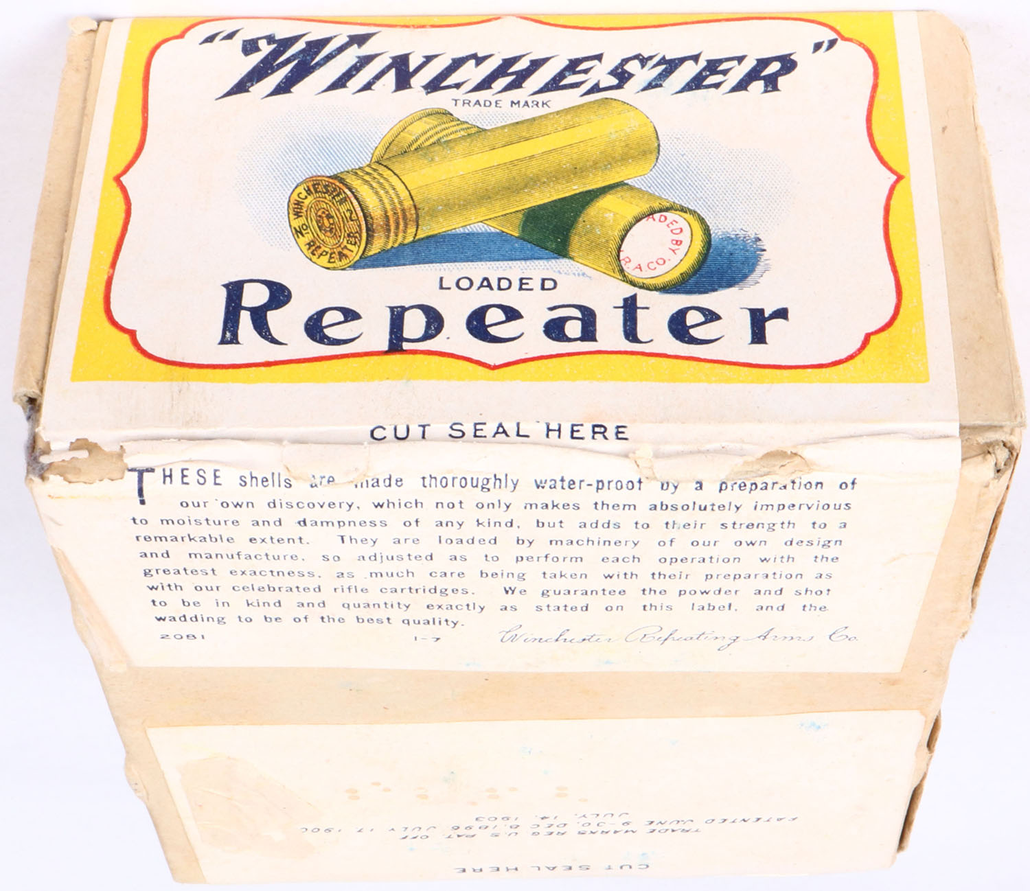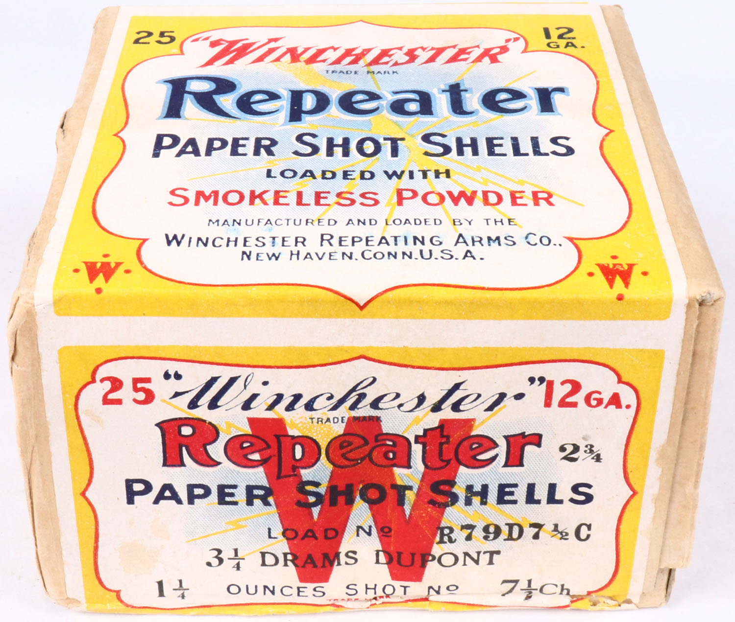 Winchester, REPEATER, 12 Gauge, 2pc., FULL & SEALED, Shot Size 7 1/2 CH, Buff box with yellow, white & red label showing lightning bolt, box has small scuff on bottom & small shell protrusion to left side. Grade: Excellent ++ - Value: 100 to 400