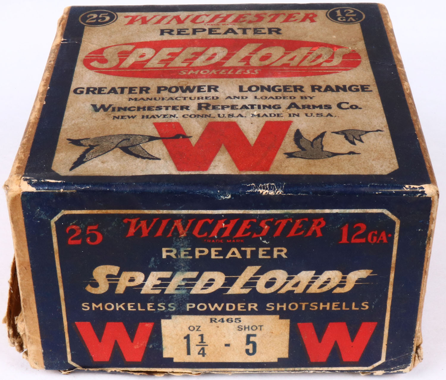 Winchester REPEATER Speed Loads, 12 Gauge, 2pc., Empty., shot size 5, buff box with dark blue red & white paper label, Box is solid with nice colors to label, box has age soiling & torn piece on left side, RARE with the REPEATER markings. Grade: Very Good ++ - Value: 80 to 200