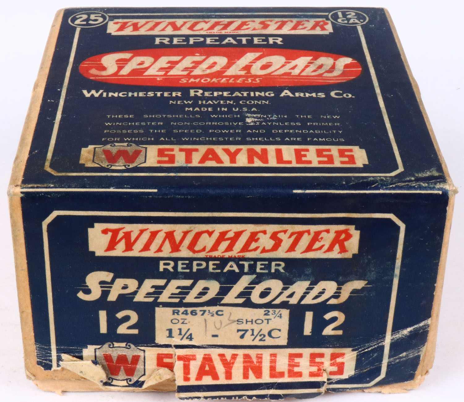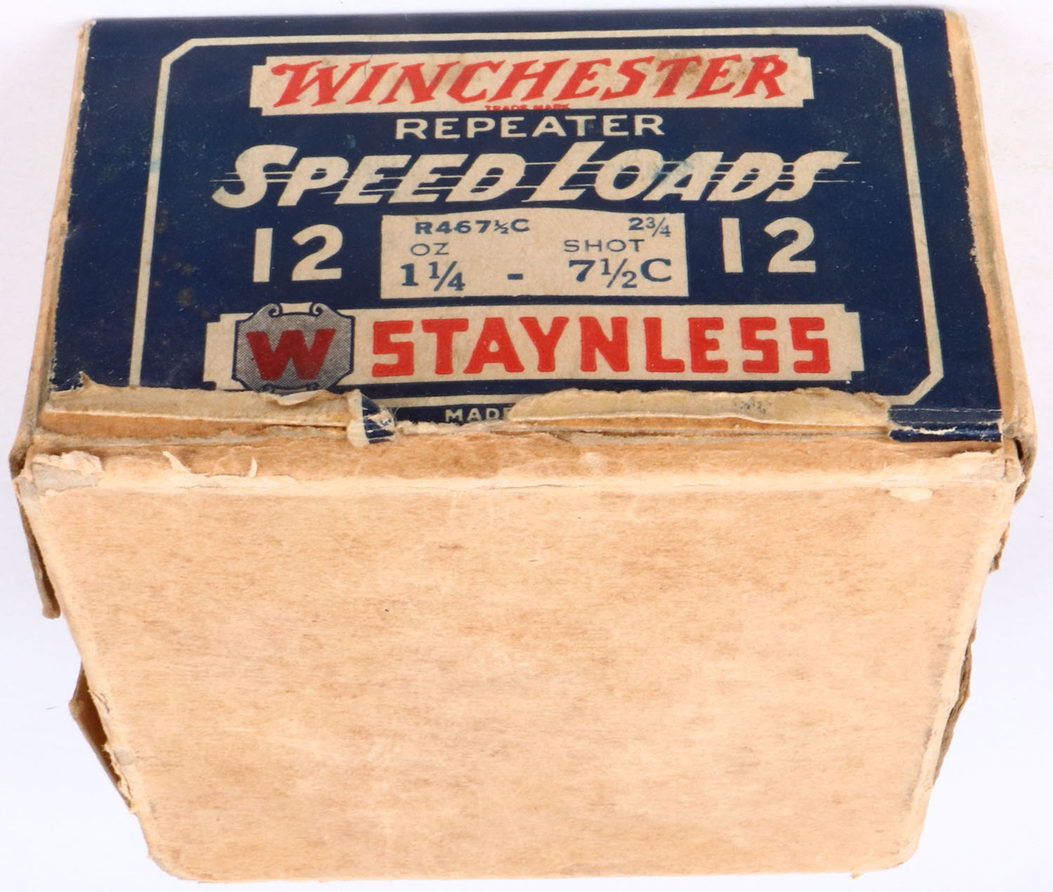 Winchester, Repeater Speed Loads, STAYNLESS, 12ga., 2pc., Empty, shot size 7 1/2 C, buff box with blue, red & white label, box is solid with excellent colors, Box has no bottom label & is torn on left side. Grade: Excellent - Value: 40 to 200