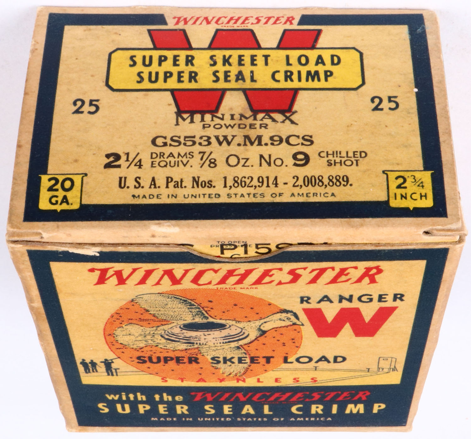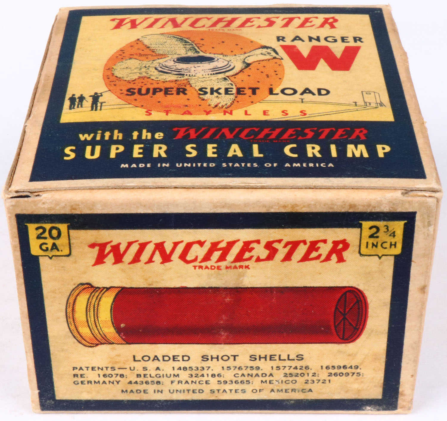 Winchester, RANGER SUPER SKEET LOAD, Minimax Powder, 20ga, 1pc., Full, White, blue & red box that pictures flying Quail with skeet in body & shot all around, Staynless, 2 3/4'', Loading: 2 1/4 Drams 7/8 Oz. 9 Chilled Shot, Box is solid with excellent colors, RARE BOX Shells are very good. Grade: Excellent + - Value: 100 to 300