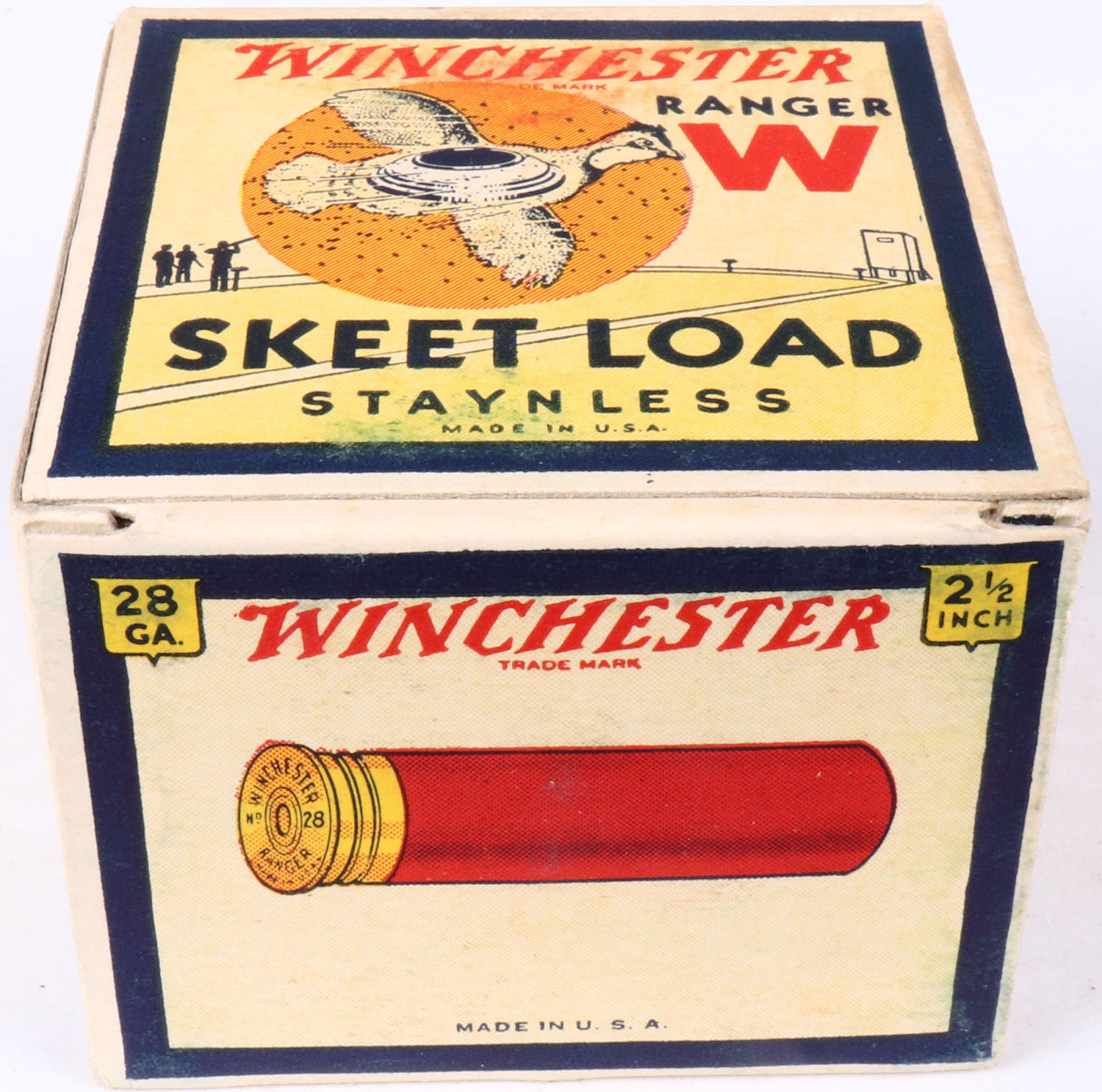 Winchester, RANGER SKEET LOAD, 28ga, 1pc., Full, White, black & red box that pictures flying Quail with skeet in body & shot all around, Staynless, 2 1/2'', Loading: 1 3/4 Drams 5/8 Oz. 9 Chilled Shot, Box is very solid with light soiling & excellent colors, Shells are excellent. RARE BOX. Grade: Excellent + - Value: 200 to 800