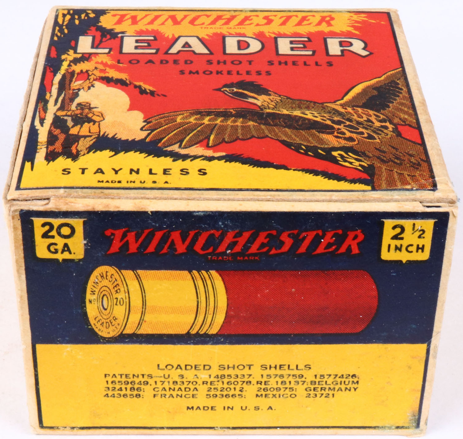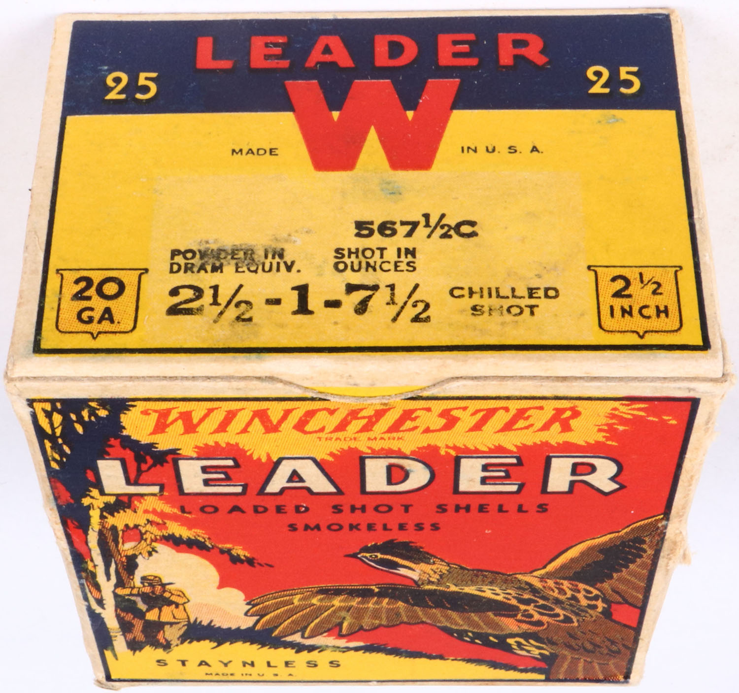 Winchester, LEADER QUAIL BOX, with Acrylic box, 20ga., 1pc., Full, shot size 7 1/2 Chilled, multi colored box with flying Quail & hunter in background, Staynless, 2 1/2'', Loading: 2 1/2 Drams 1 Oz. 7 1/2 Chilled Shot, box is solid with small edge wear on right side, has great colors, Shells are very good. Grade: Excellent + - Value: 300 to 800