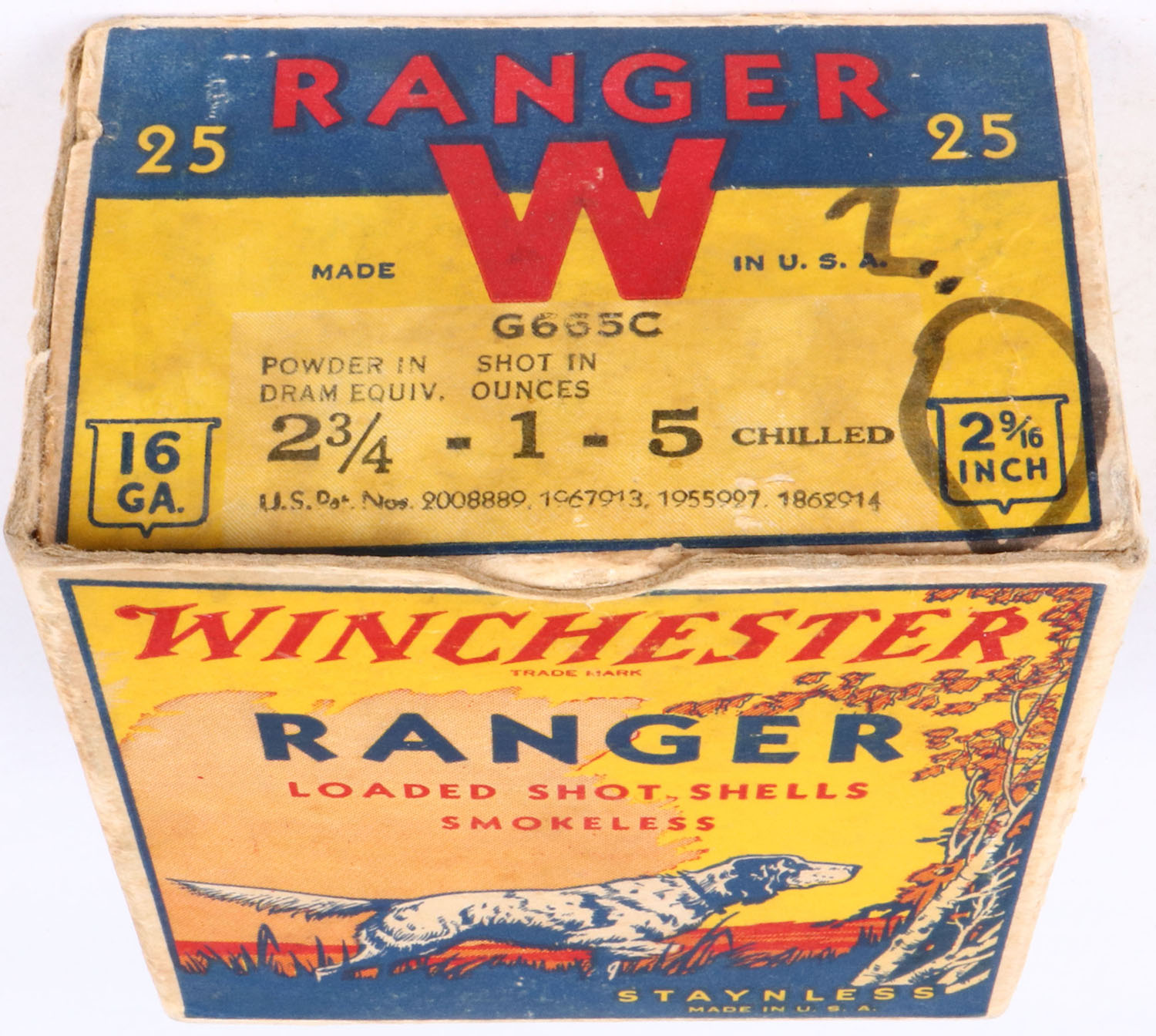 Winchester, Ranger, 12ga, 1pc., Empty, Shot Size 5 Chilled, multi colored box, dog on point, 2 9/16'', box has top inside flap disconnected with great colors. Grade: Excellent - Value: 40 to 100