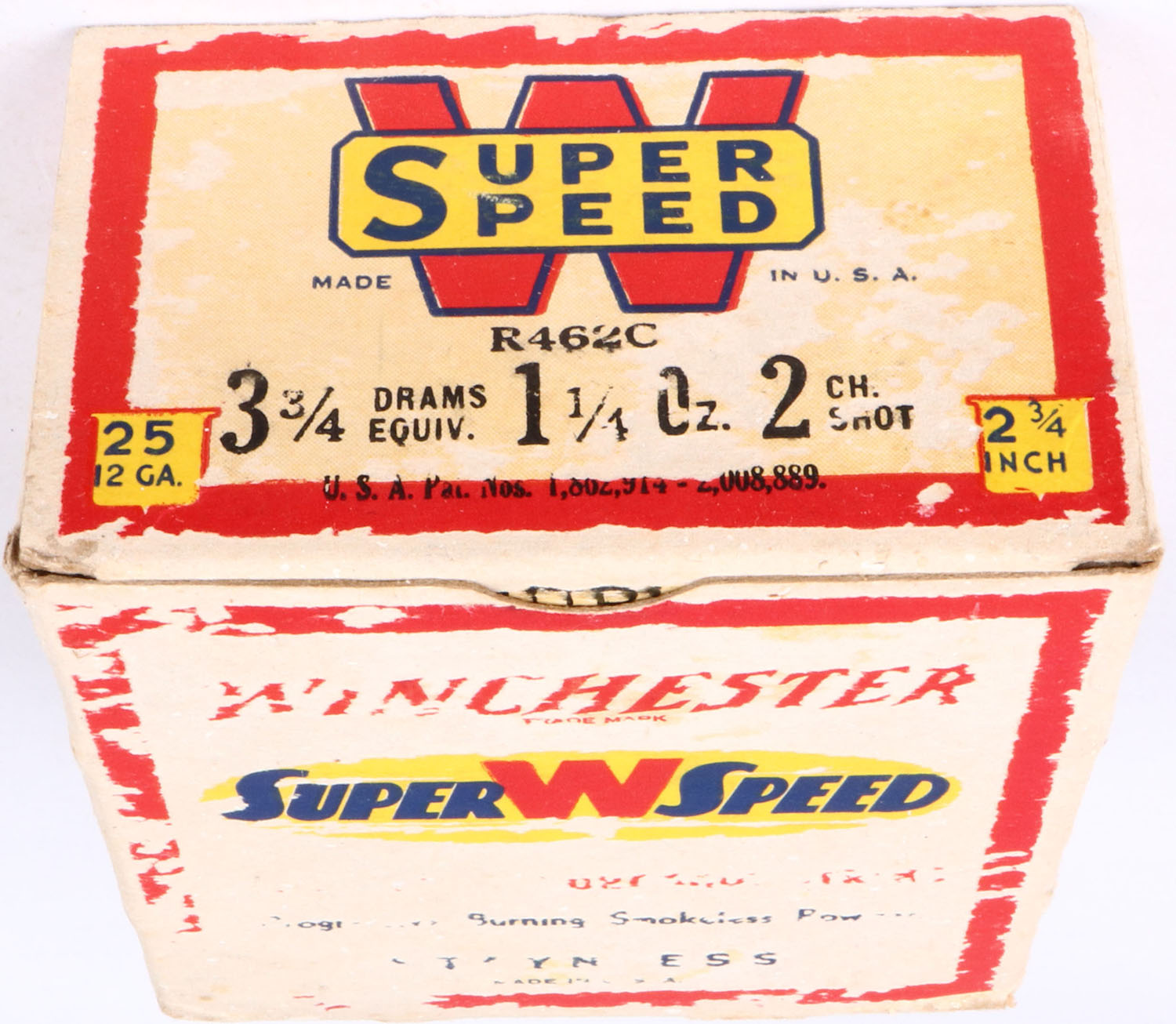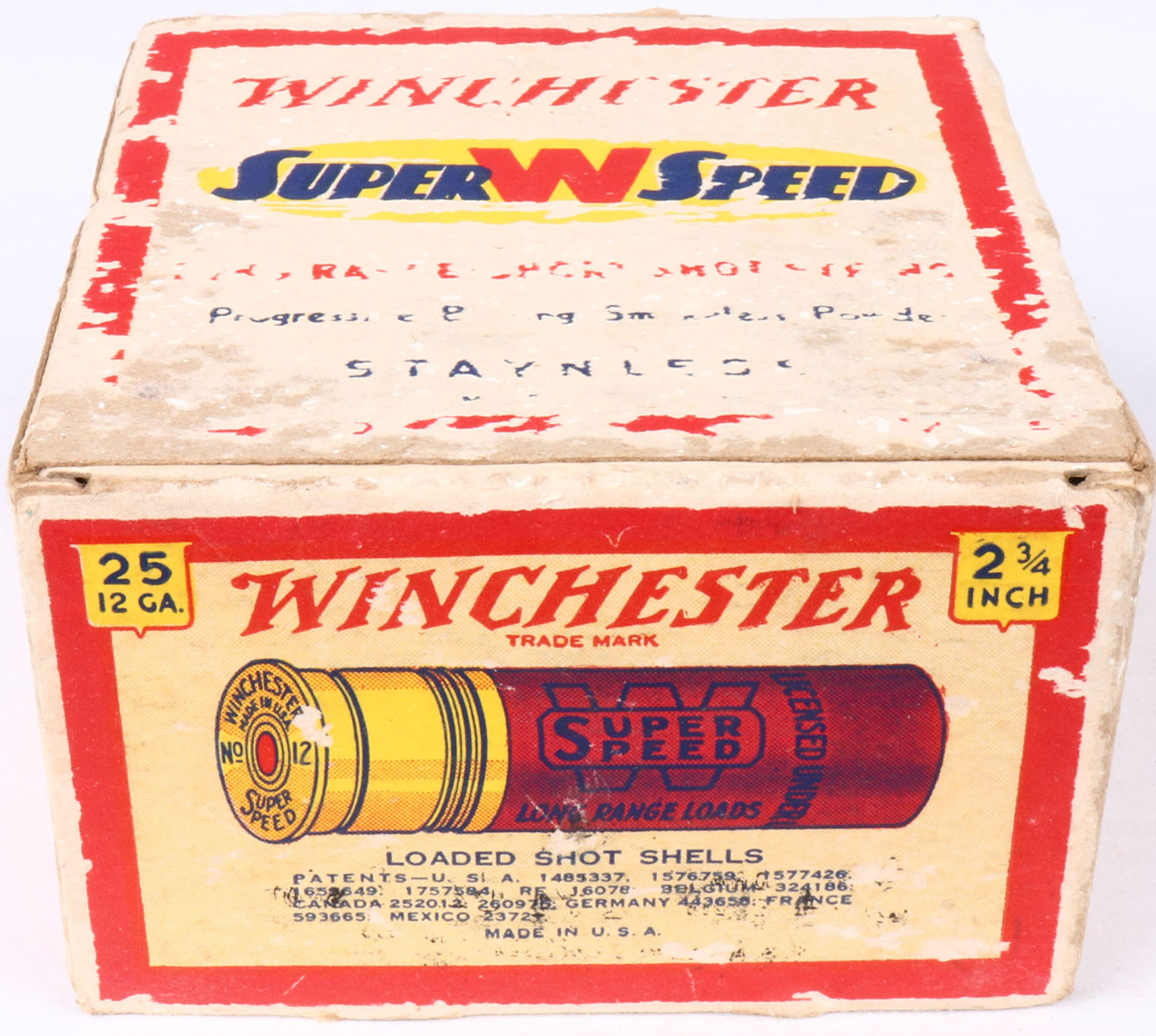 Winchester, Super W Speed, 12ga., Staynless, 2 3/4 in., 1pc., Full, shot size 2CH, cream red, blue and yellow box, box is solid with major scuffing, shells are poor. Grade: Good ++ - Value: 6 to 20