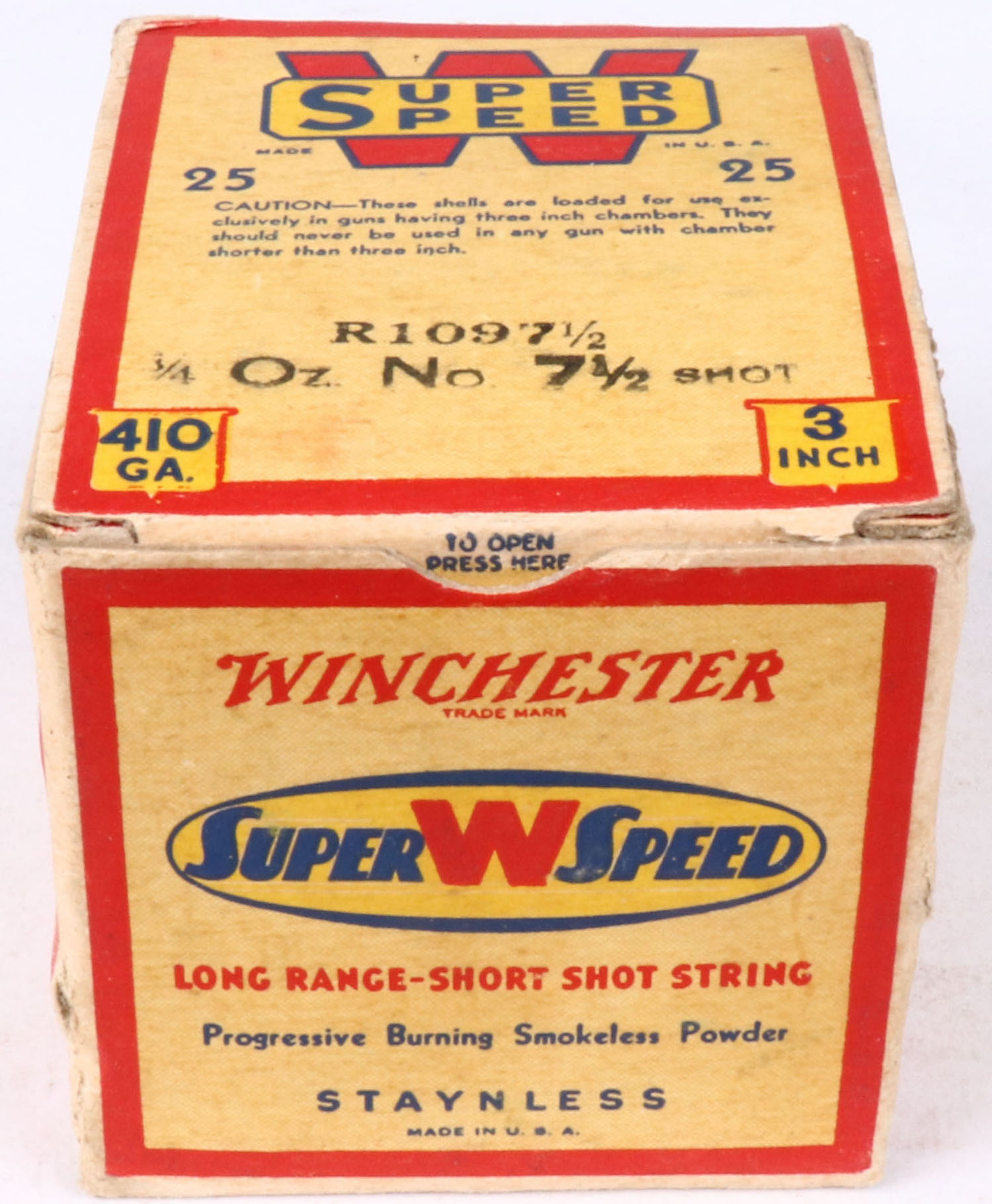 Winchester, Super W Speed, 410ga., Staynless, 3'', 1pc., Full, shot size 7 1/2, cream red, blue and yellow box, box is solid with great colors, shows some light age soiling & few shell protrusions, shells are excellent. Grade: Excellent + - Value: 10 to 30