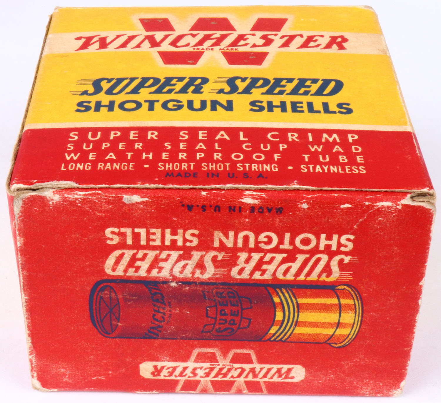 Winchester, Super Speed, 16ga., 1pc., Partial 7rds, 2 3/4''., shot size 6, red, yellow & blue box, box has light soiling & great colors, shells are excellent. Grade: Excellent - Value: 10 to 30