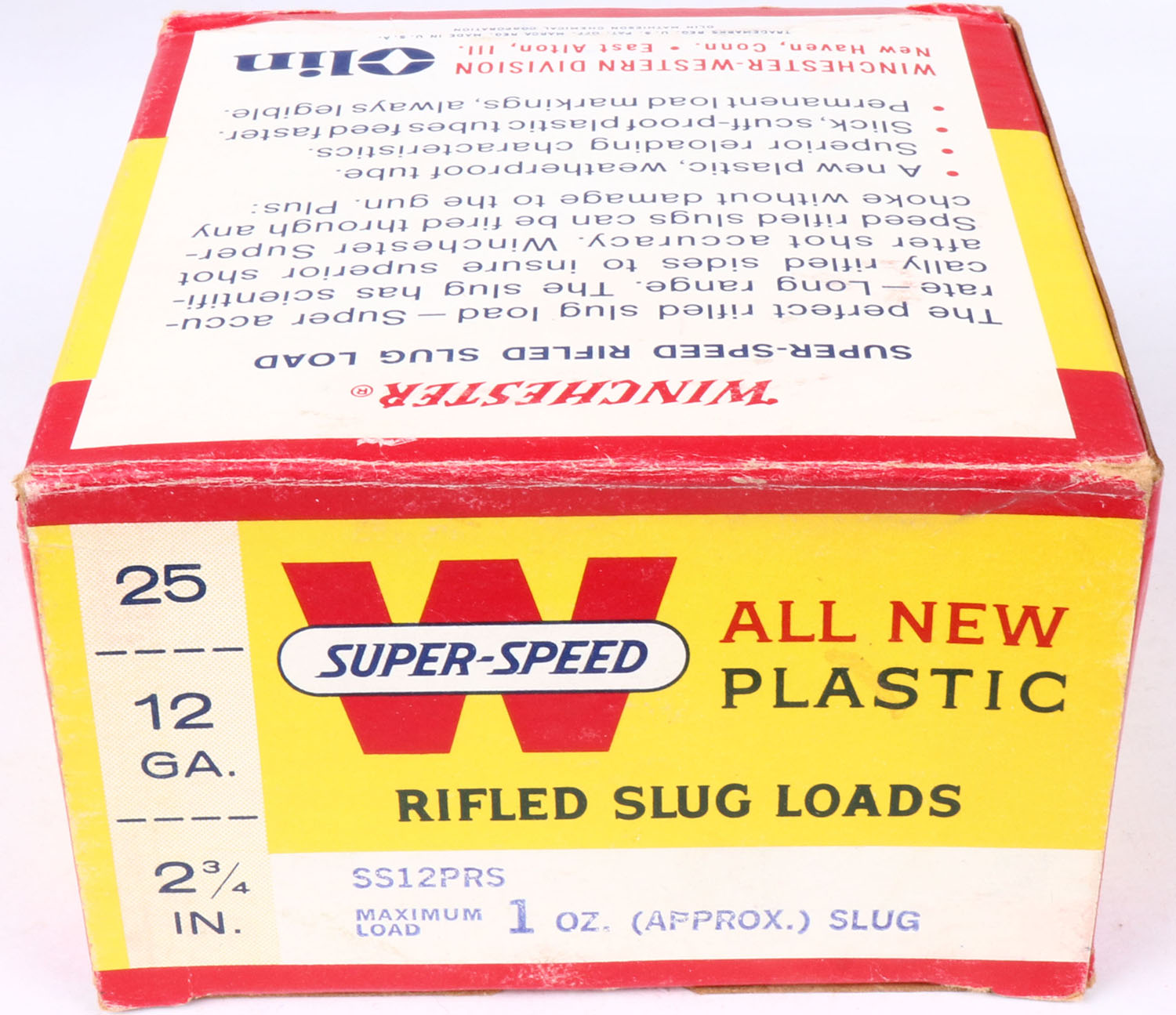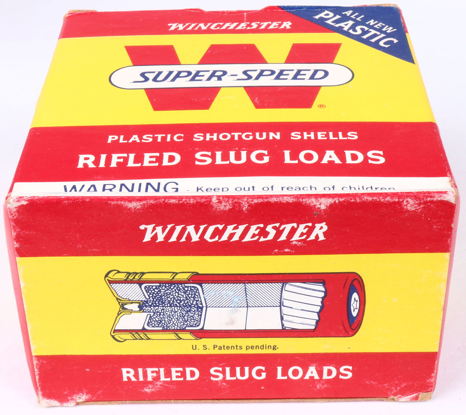 Winchester, Super Speed, 12ga., 1pc., Full with 5rds being Western paper slugs, shot size Rifled Slugs, red, blue and white box, box is very solid with great colors, shells are excellent. Grade: Excellent ++ - Value: 10 to 30