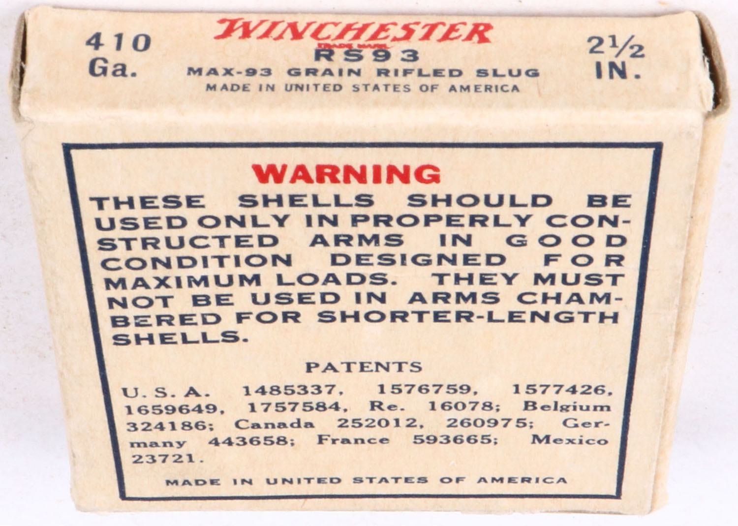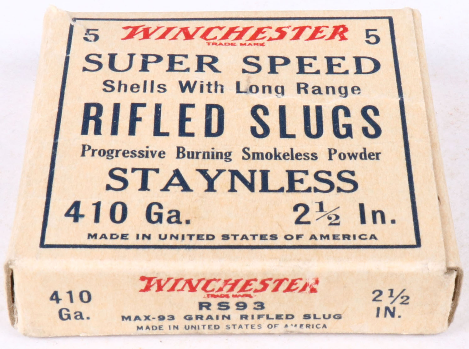 Winchester, Super Speed, 410ga., 1pc., Full, shot size Rifled Slugs, red, blue and white box, box is very solid with great colors, shells are very good. Grade: Excellent + - Value: 4 to 20