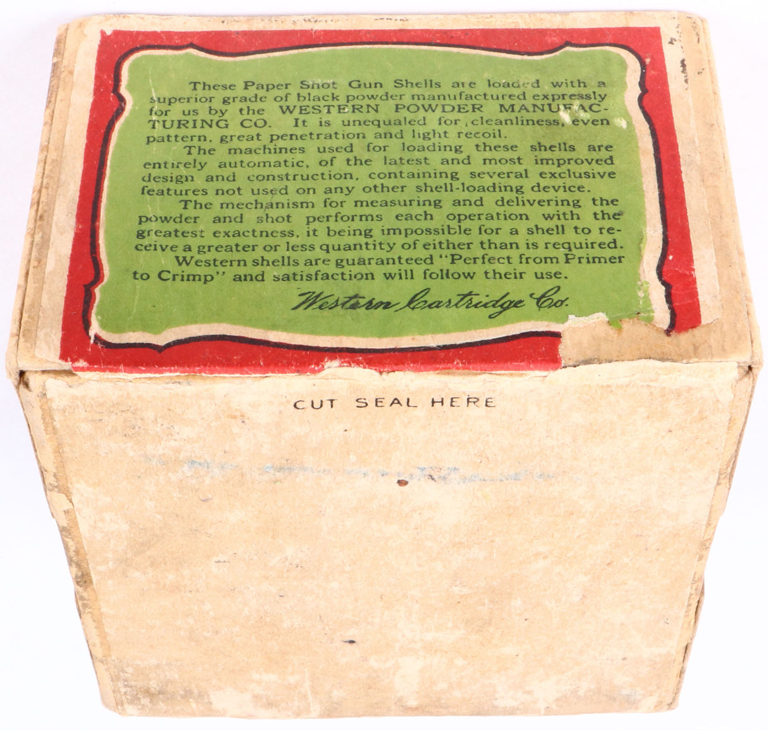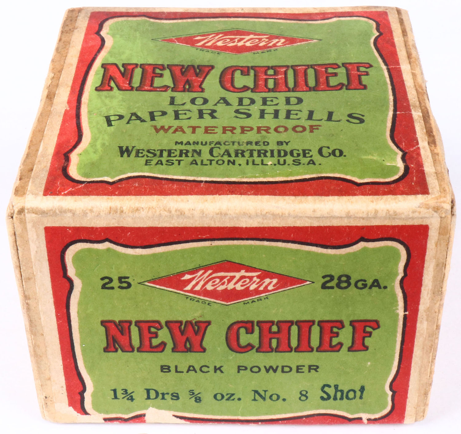 Western, NEW CHIEF, 28ga., 2pc., Empty, shot size Black Powder 1 3/4 Drs. 5/8 Oz. No. 8 Shot, buff box with green, red & black label, box is very solid with very nice colors, box has age soiling & tape repair, Western Diamond Logo on 2 sides. Grade: Excellent - Value: 50 to 250