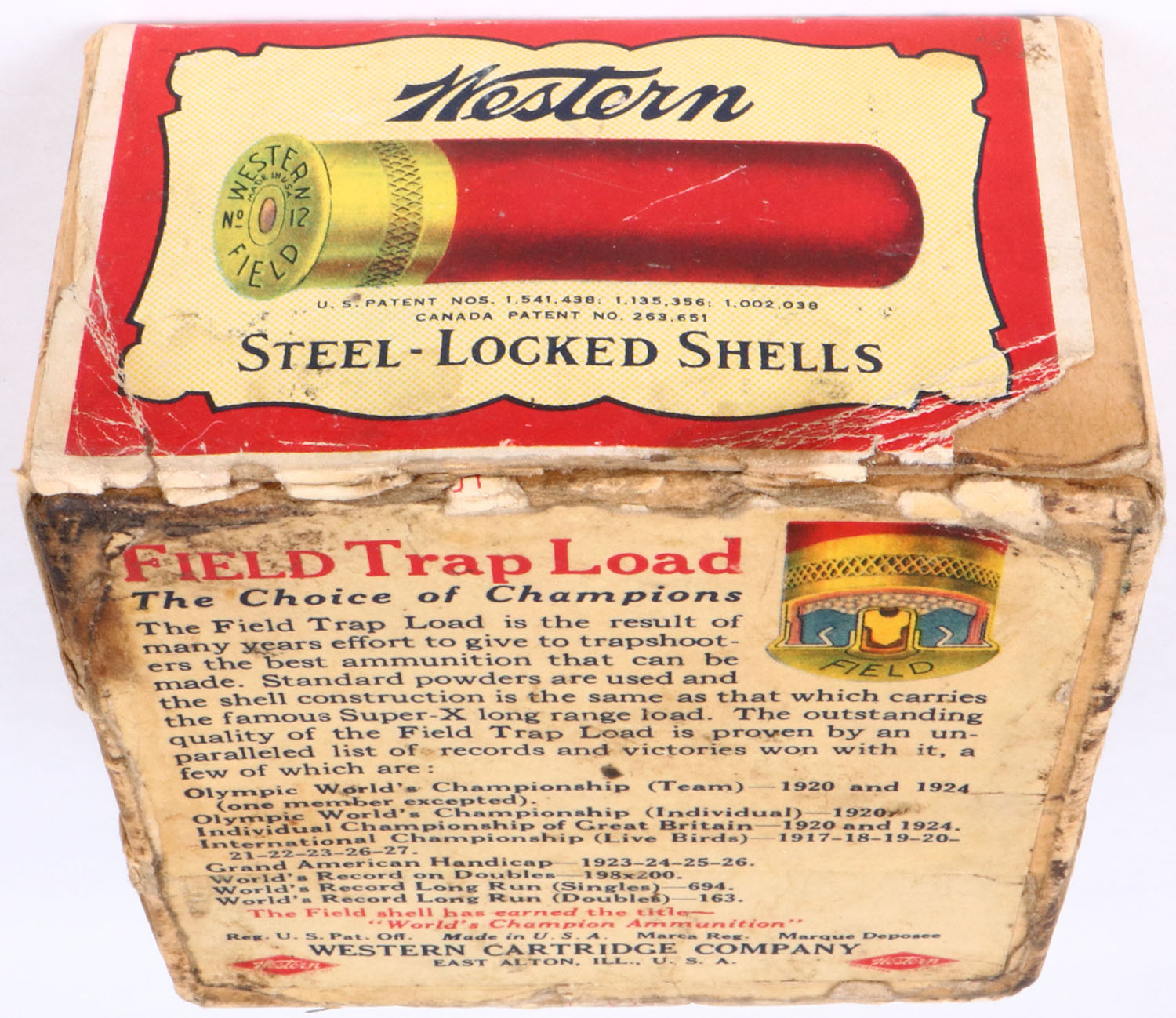 Western, Field Trap Load, 12ga., 2pc, Empty, shot size 8 Chilled, box has clap pigeon shattering, has age soiling, light edge wear with very good label. Grade: Excellent - Value: 200 to 800
