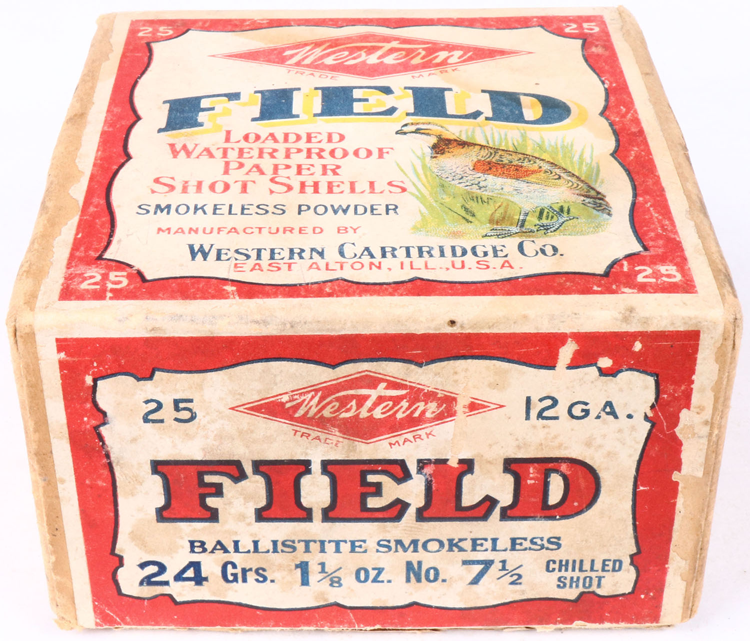 Western, Field, 12ga., 2pc, Full, shot size 7 1/2 Chilled, box has soiling, scuffing & shell protrusions with very good label, Shells are excellent. Grade: Excellent - Value: 50 to 250