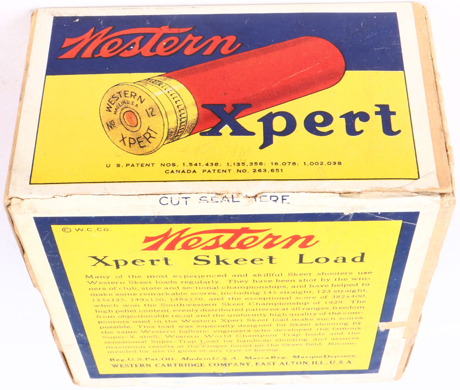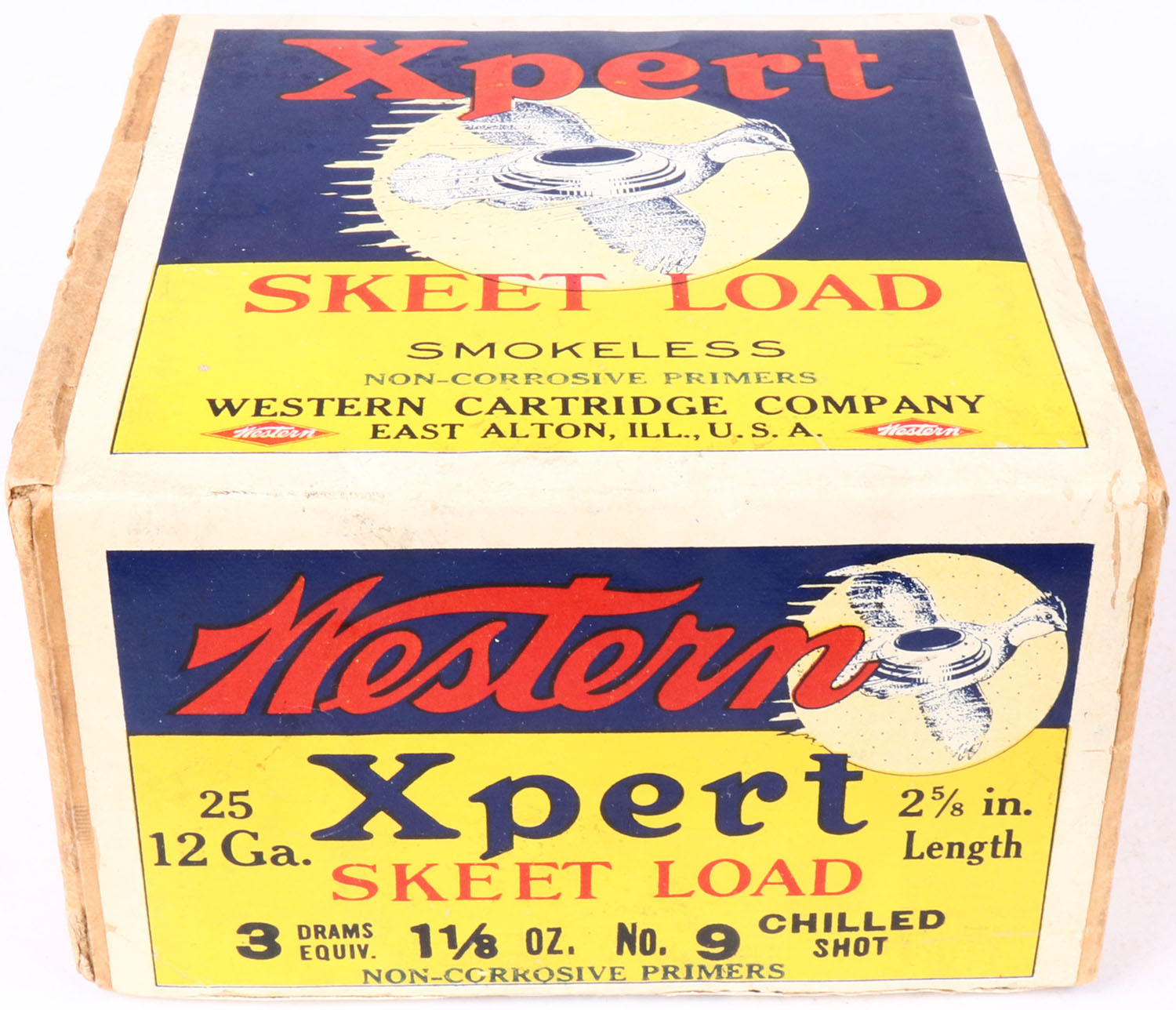 Western Xpert, SKEET LOAD, 12ga., 2pc., Empty, white, blue & red box that pictures flying Quail with skeet in body & shot all around, Loading: 3 Drams 1 1/8 Oz. No. 9 Chilled Shot, box has seam split, torn left side & light edge wear with great colors. Grade: Excellent - Value: 200 to 600