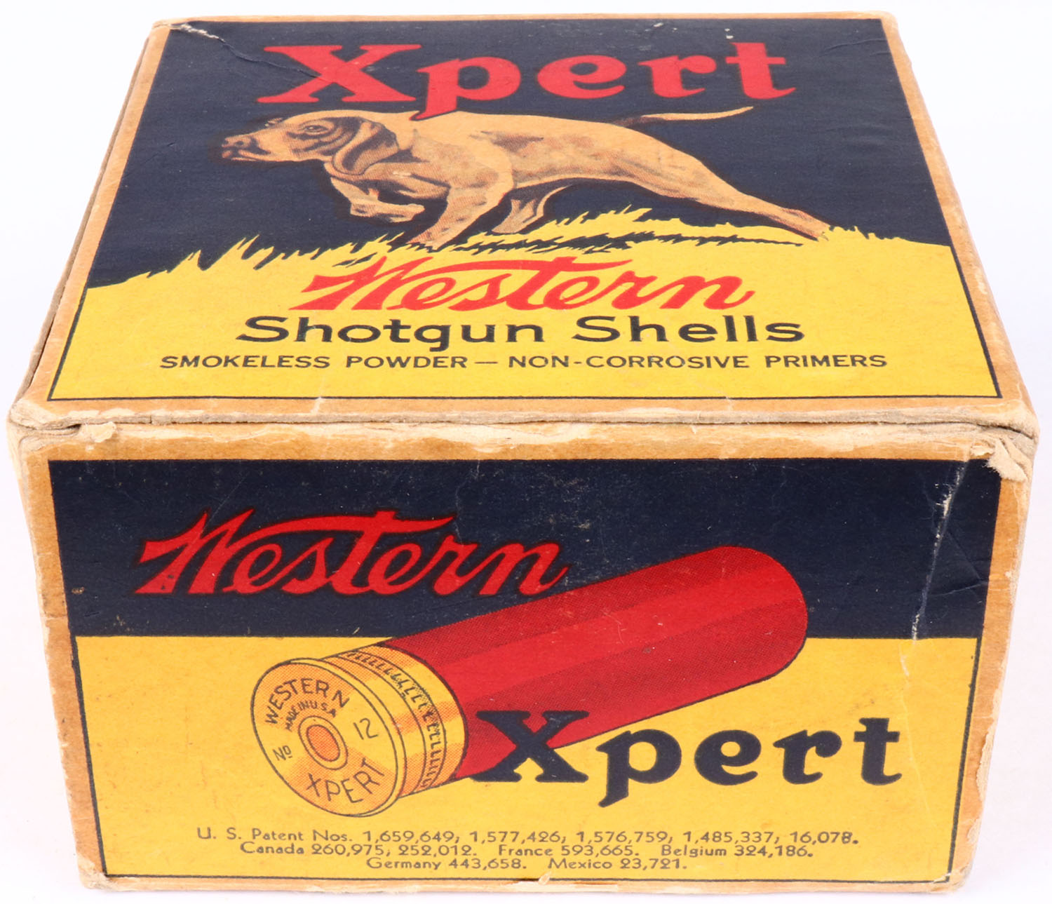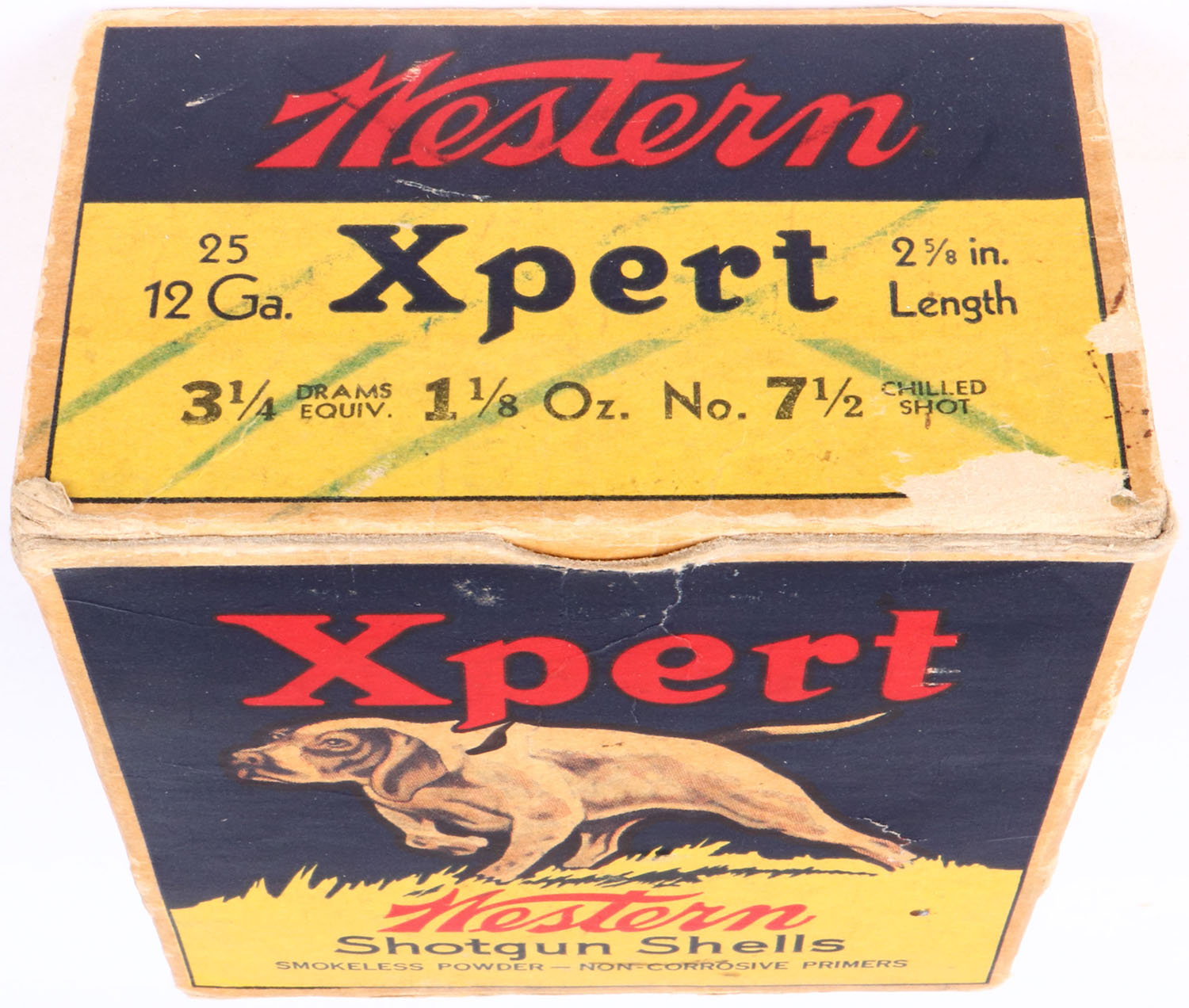 Western Cart. Co., Xpert, 12ga., 1pc., Empty, blue, yellow & red box with a dog on point, No. 7 1/2 Chilled Shot, box has light edge wear, very light soiling, & minor scuffing to top, box has great colors. Grade: Excellent - Value: 20 to 60