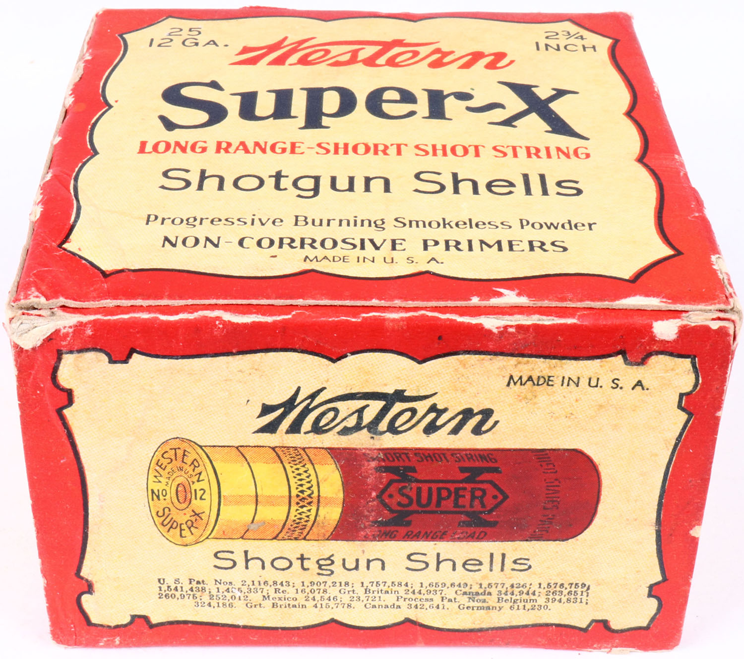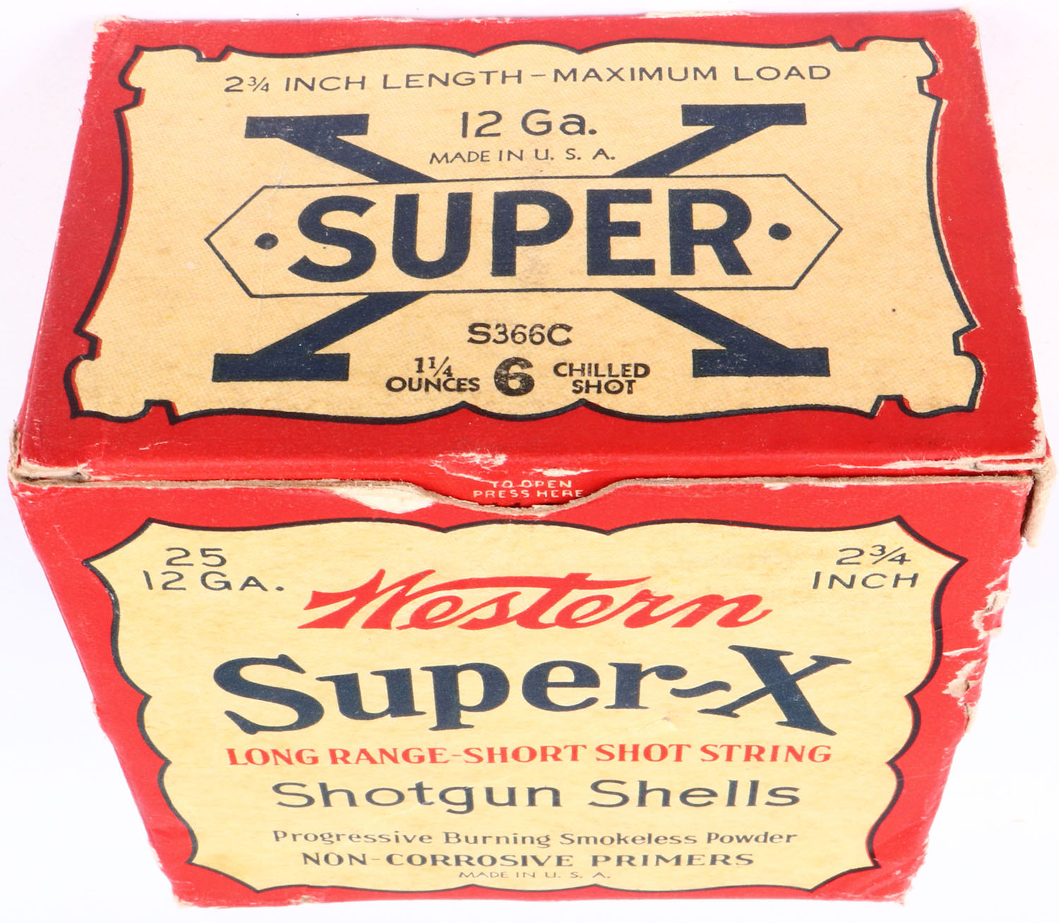 Western Cart. Co., Super X, 2 3/4'', 12ga., 1pc., Full, 6 Chilled Shot, red, buff & black box, box is solid with great colors, box has edge wear & small puncture on front of box, Shells are excellent. Grade: Excellent - Value: 20 to 60