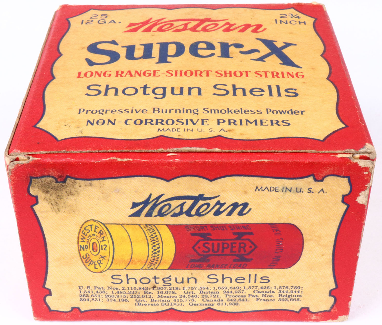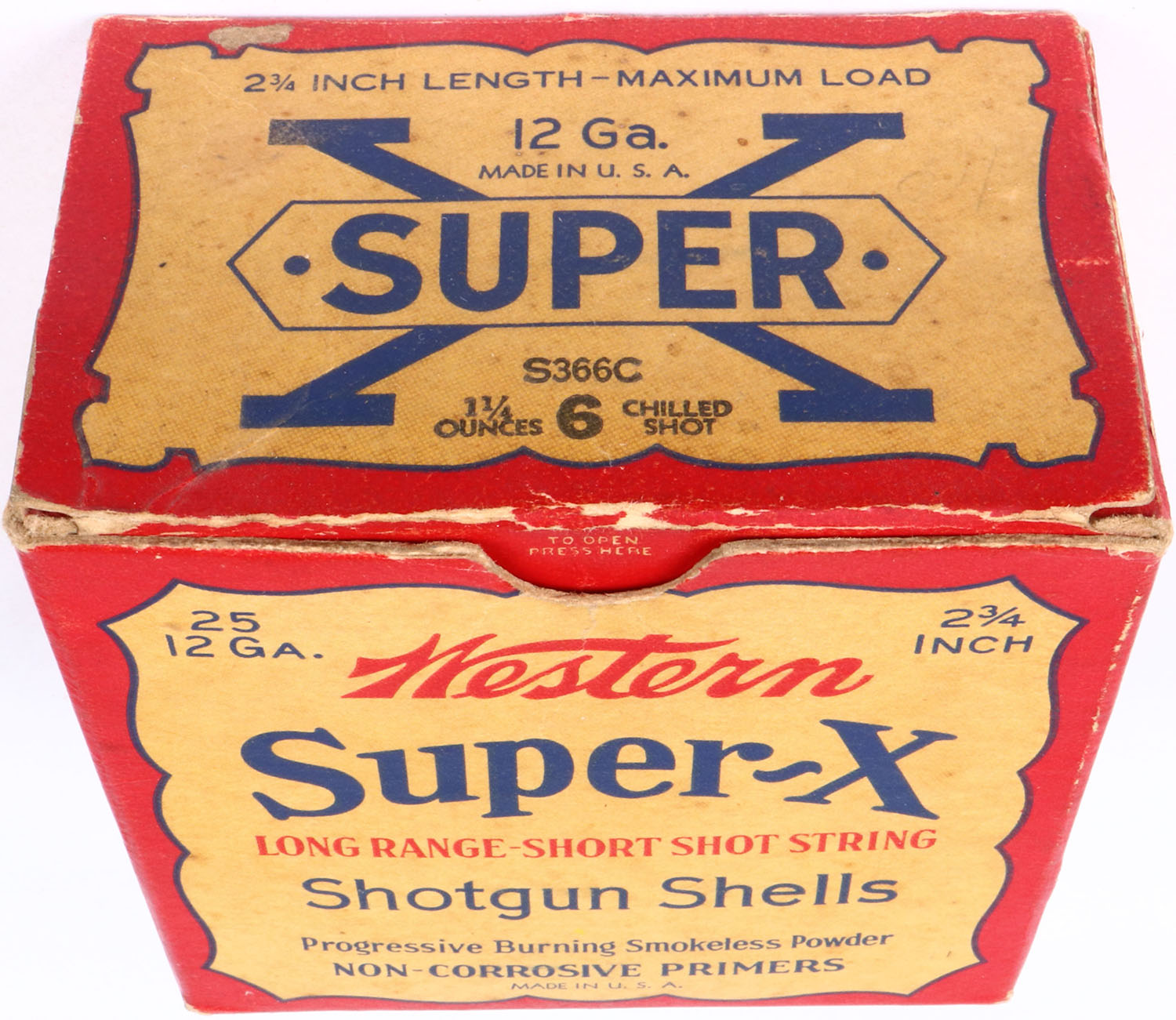 Western Cart. Co., Super X, 2 3/4'', 12ga., 1pc., Full, 6 Chilled Shot, red, buff & black box, box is solid with very nice colors, box has light edge wear, light soiling & light scuffing, Shells are very good. Grade: Excellent - Value: 20 to 60