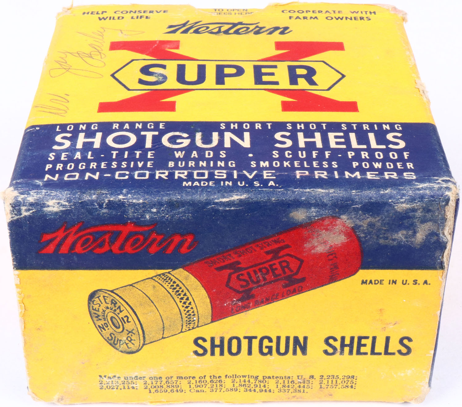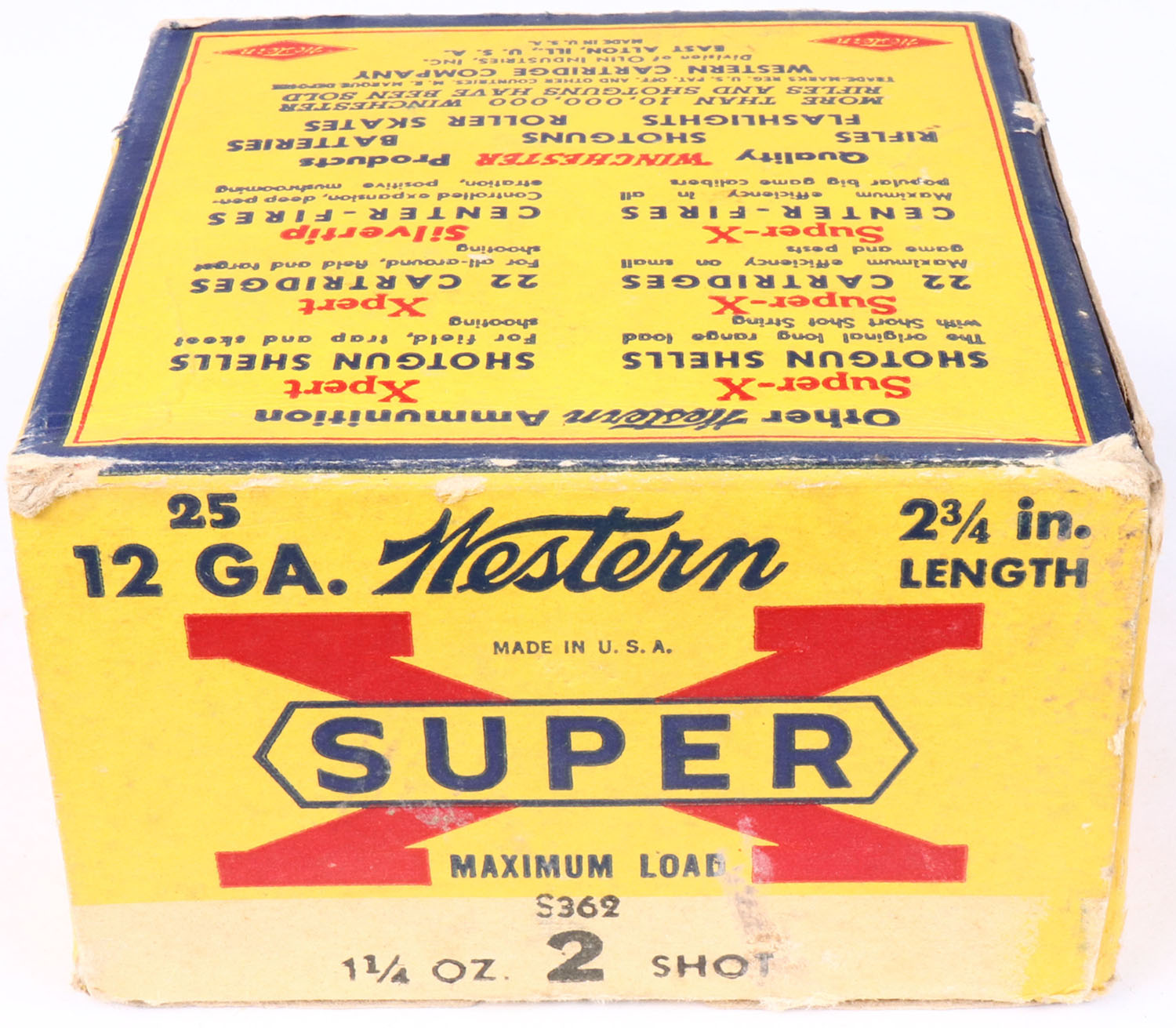 Western, Super X, 12ga., 2 3/4'', 1pc., Partial 18rds., shot size 2, multi-colored box, box is solid with light edge wear & light soiling, box has great colors, shells are very good. Grade: Excellent - Value: 10 to 30
