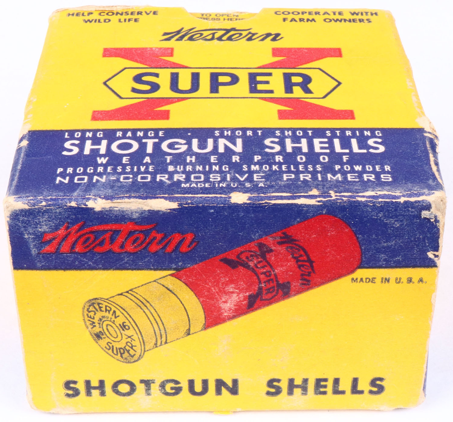 Western, Super X, 16ga., 2 9/16'', 1pc., Full, shot size 6, multi-colored box, box is solid with light edge wear, box has great colors, shells are excellent. Grade: Excellent - Value: 10 to 30