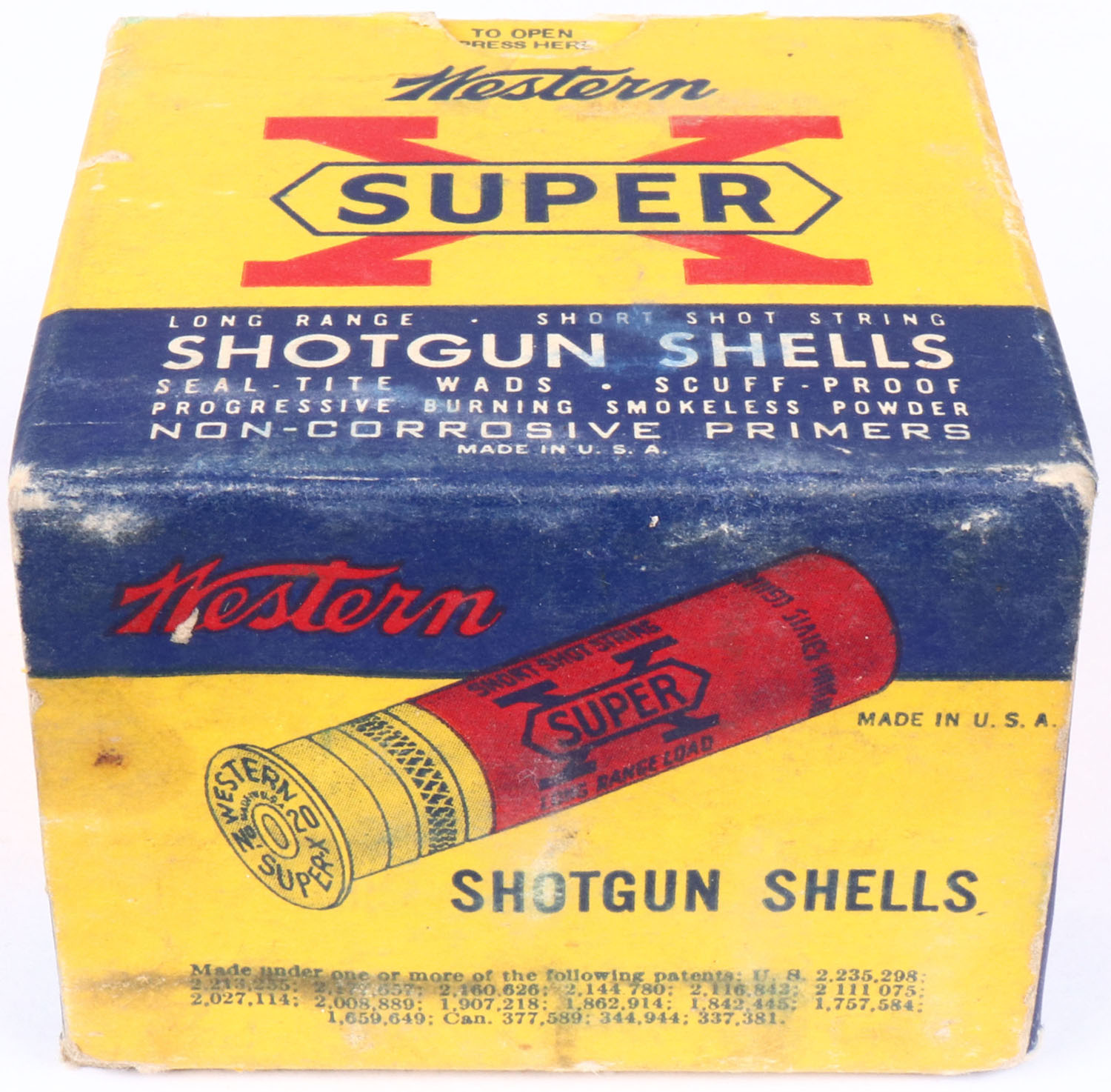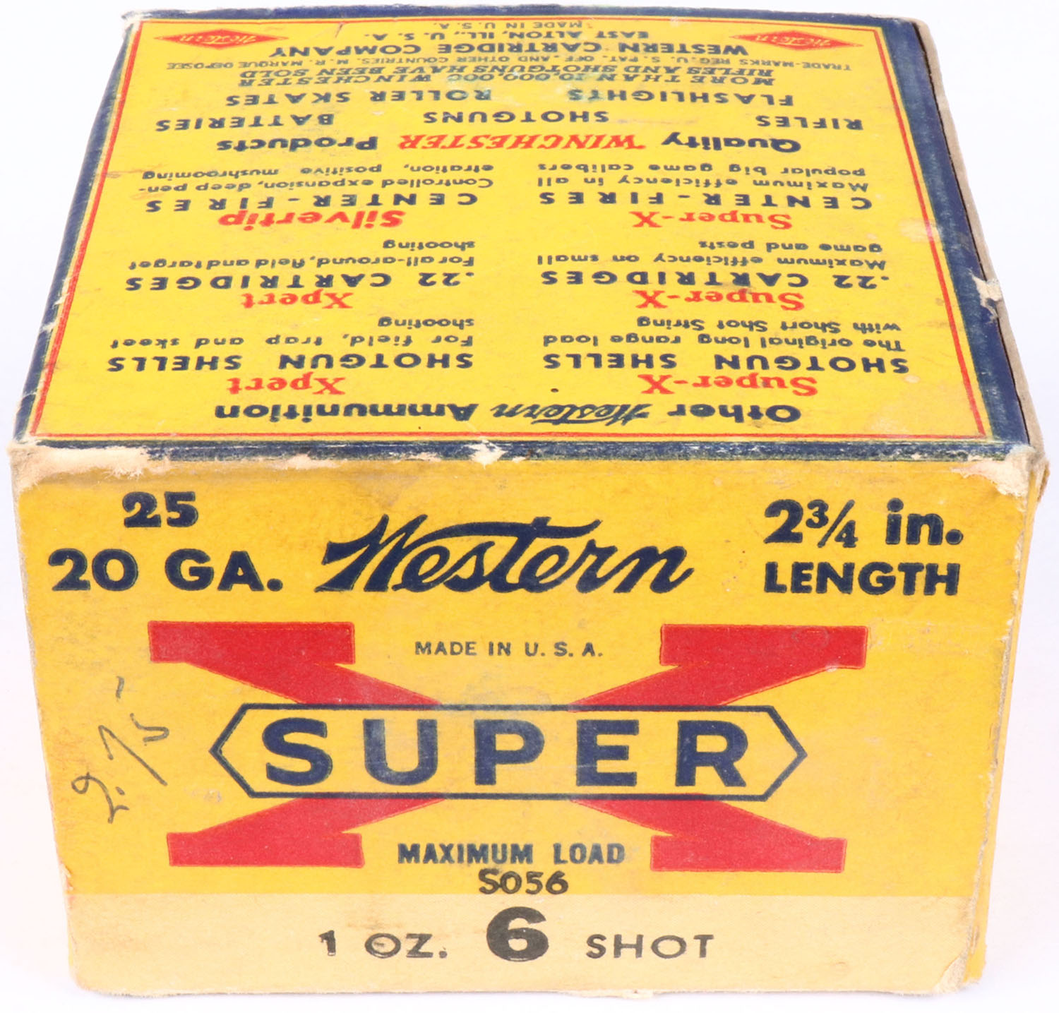 Western, Super X, 20ga., 2 3/4'', 1pc., Partial 24rds., shot size 6, multi-colored box, box is solid with age soiling, box has very nice colors, shells are very good. Grade: Excellent - Value: 10 to 30