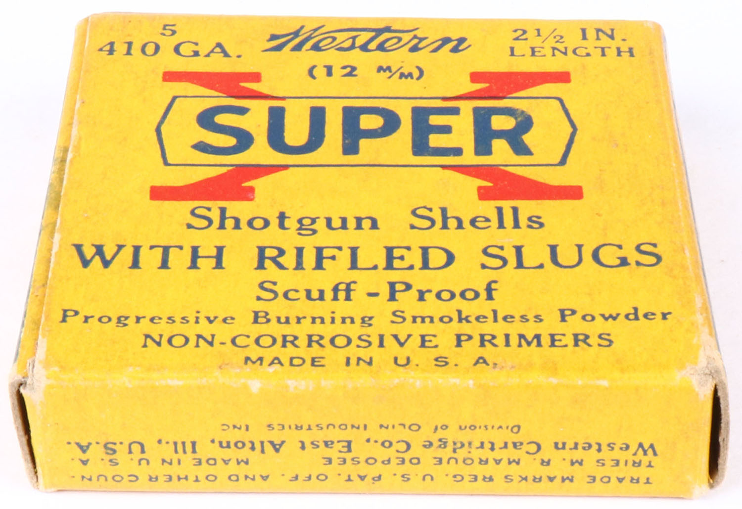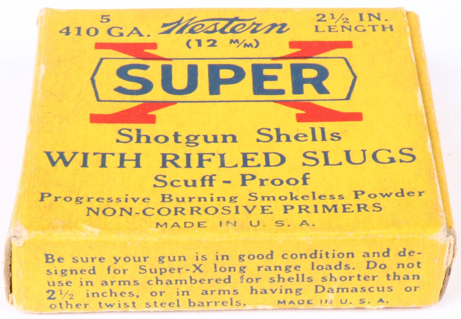 Western, Super X, 410ga., 2 1/2'', 1pc., Full, shot size Rifled Slugs, multi-colored box, box is very solid with great colors, shells are excellent. Grade: Excellent - Value: 4 to 20