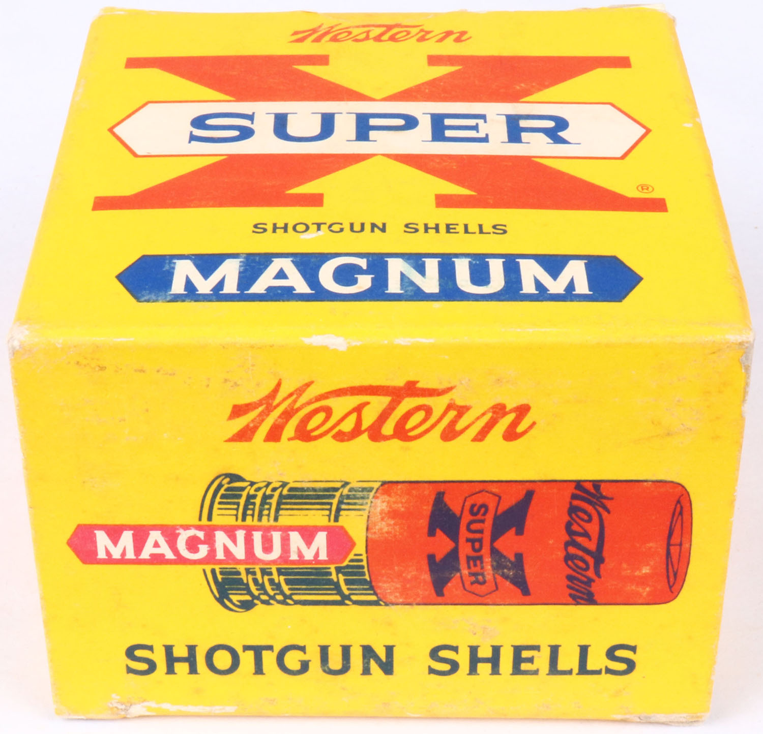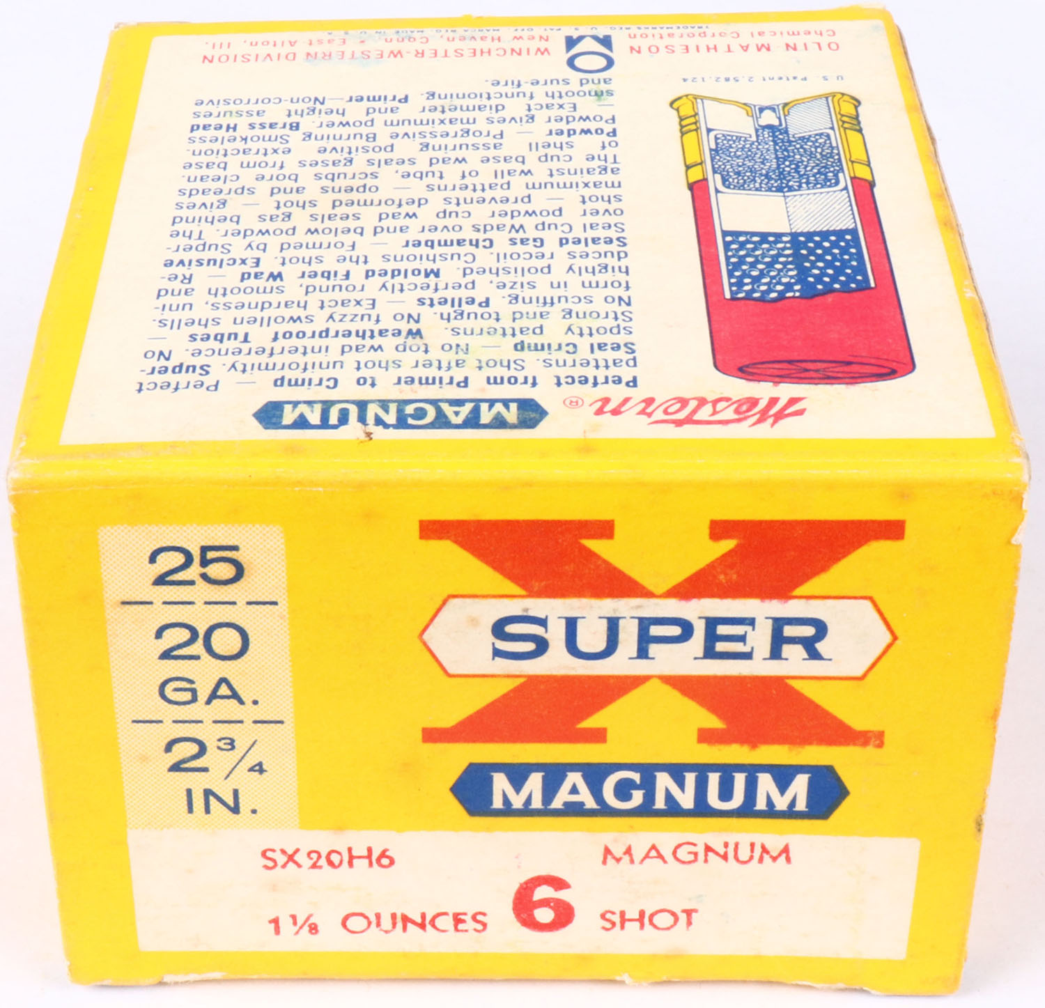 Western, Super X, 20ga., 2 3/4'', 1pc., Partial 24rds., shot size 6 Magnum, multi-colored box, box is very solid with great colors, Shells are excellent. Grade: Excellent - Value: 10 to 30