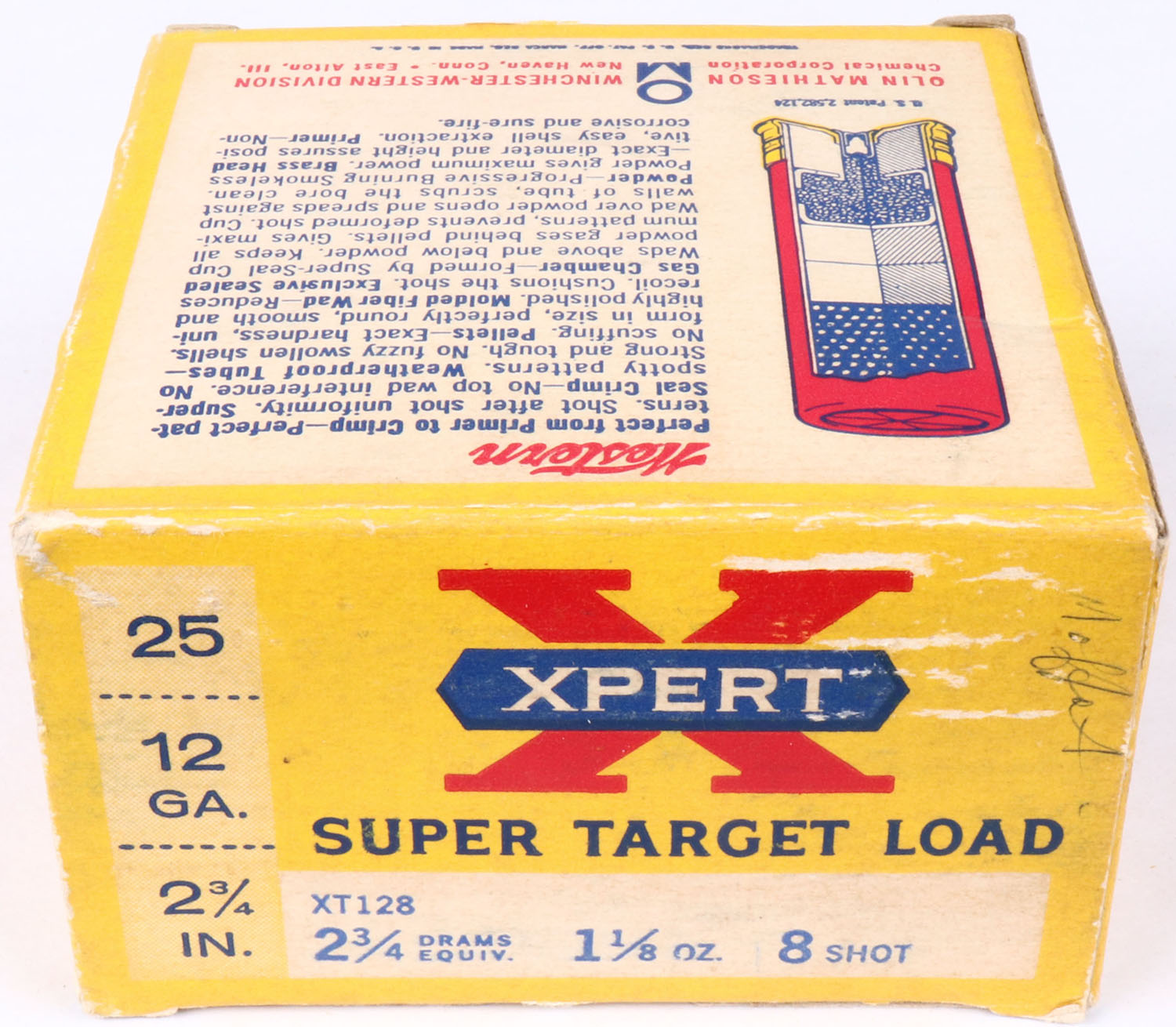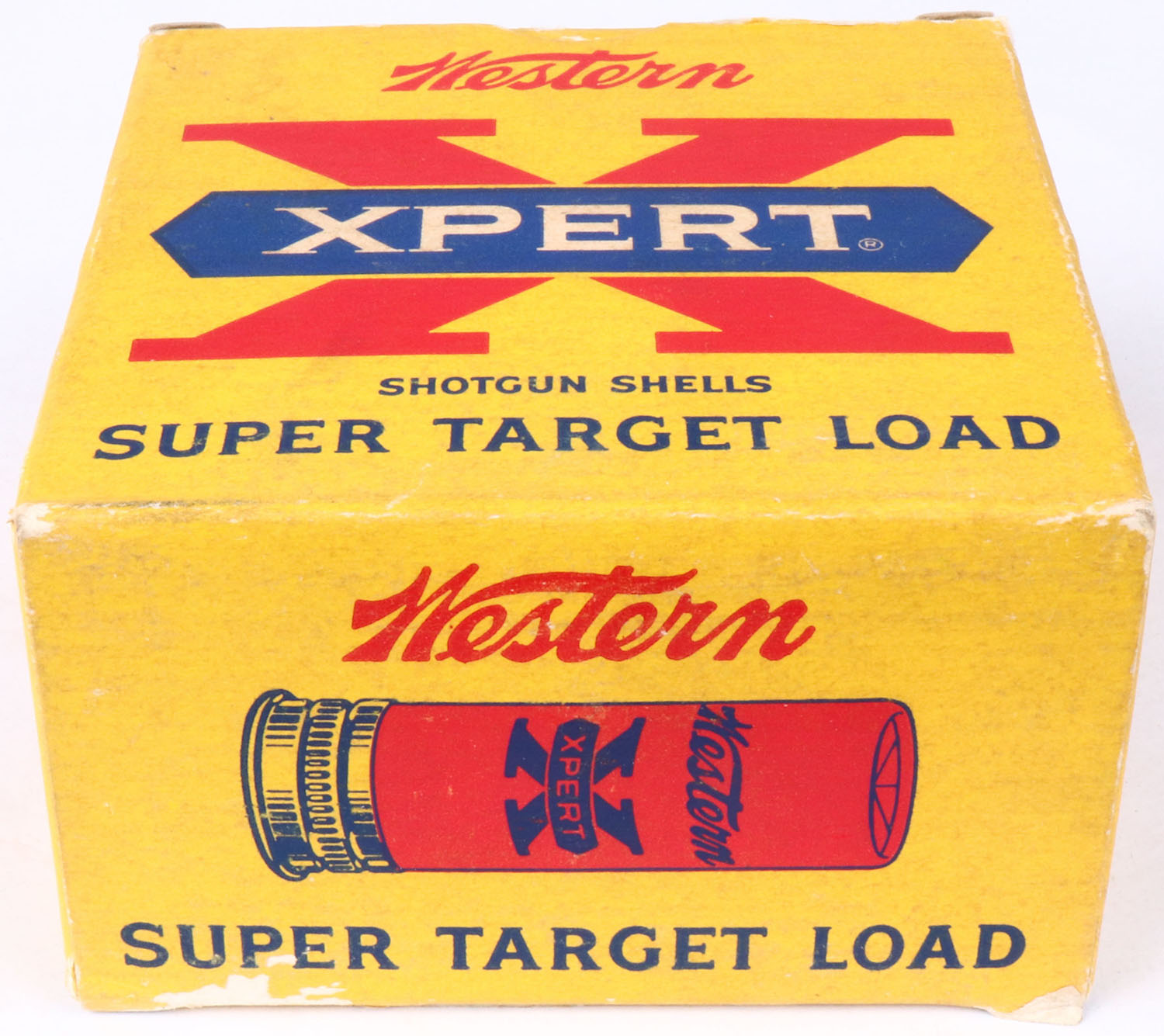 Western, Xpert, 12ga., 2 3/4'', shot size 8 Super Target Load, 1pc., Full, multi-colored box, box is very solid with light age soiling but very nice color, shells are excellent. Grade: Excellent - Value: 10 to 30