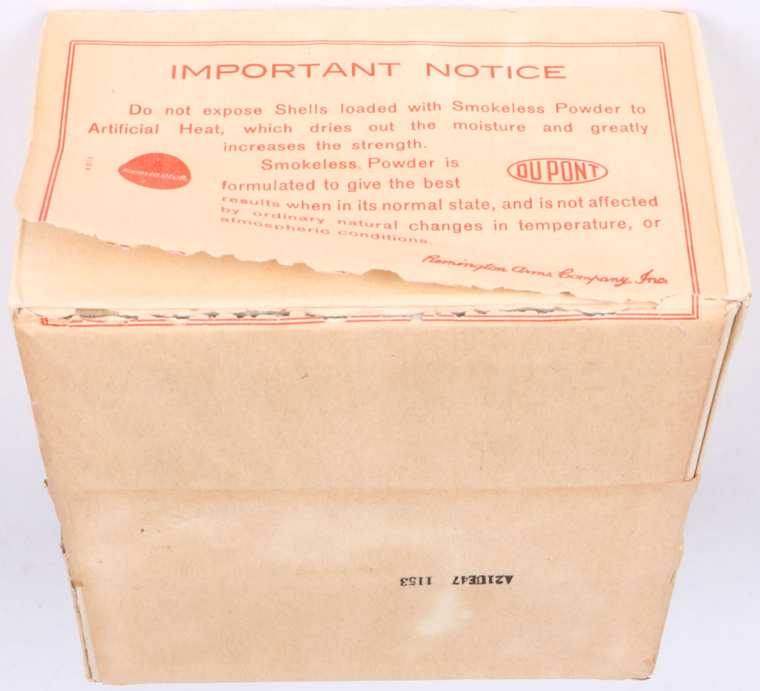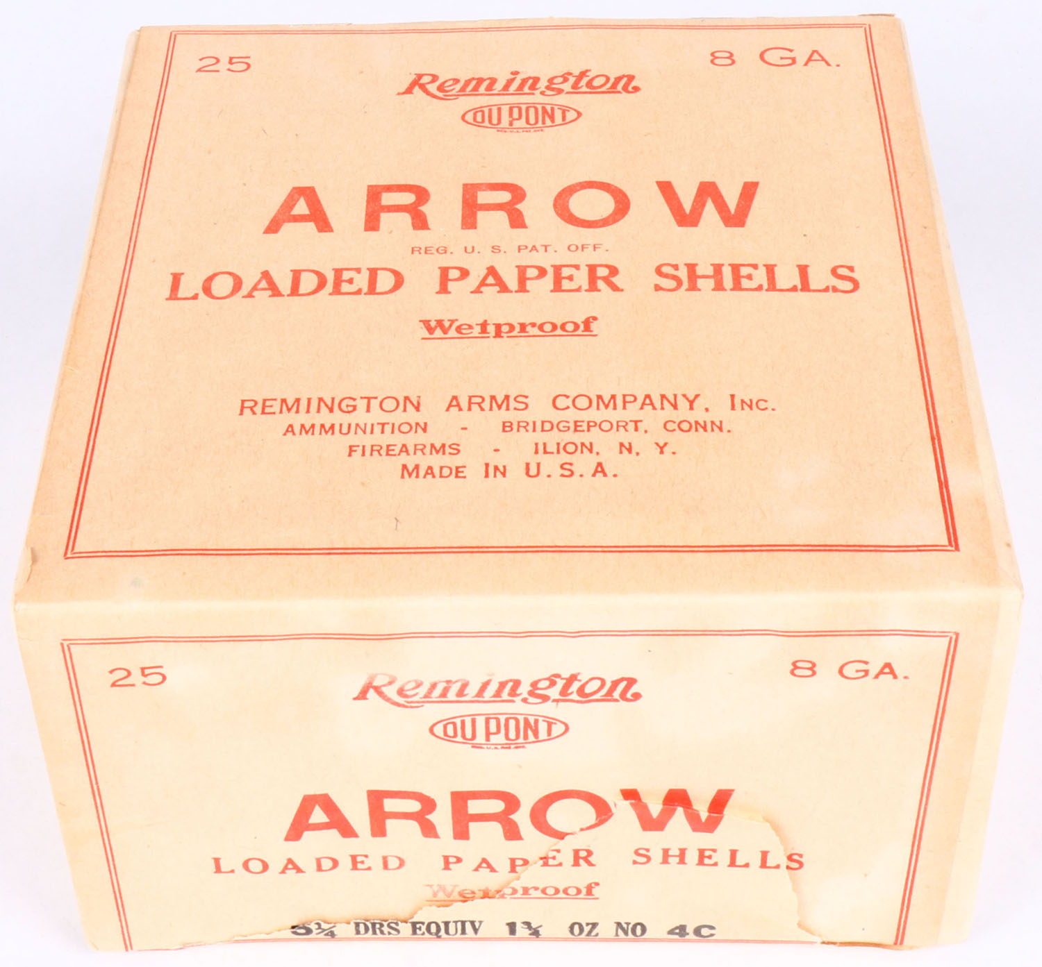 Remington, ARROW, 8ga., 2pc., FULL & SEALED, shot size 4c, buff box with buff & orange label, box & label are near perfect, hard to fid an 8 GAUGE box in this condition! Grade: Excellent ++ - Value: 200 to 800