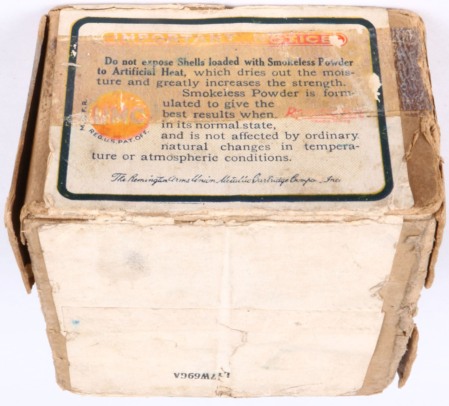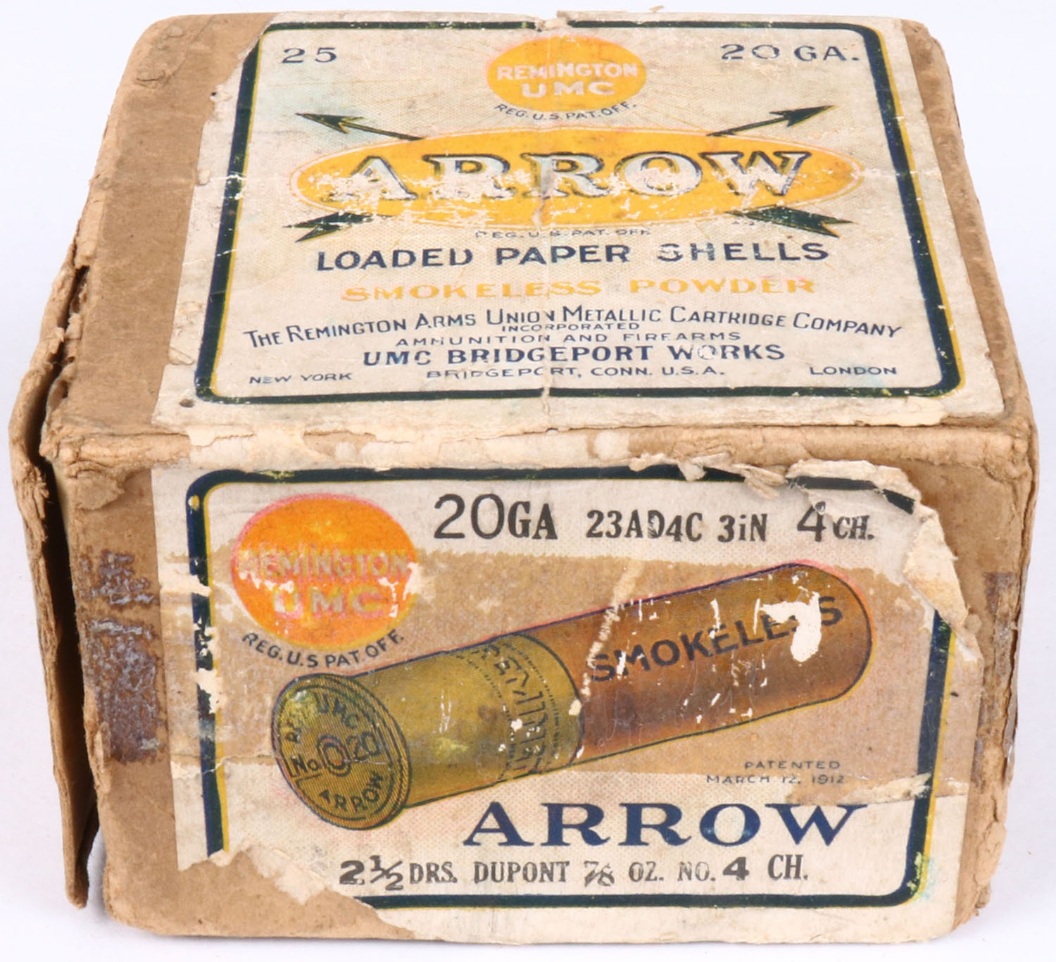 REM UMC, ARROW, 20ga., 2pc., Empty, shot size 4CH, buff box with sunburst logo, box has seam splits, edge wear & age soiling with nice colors. Grade: Very Good - Value: 10 to 60