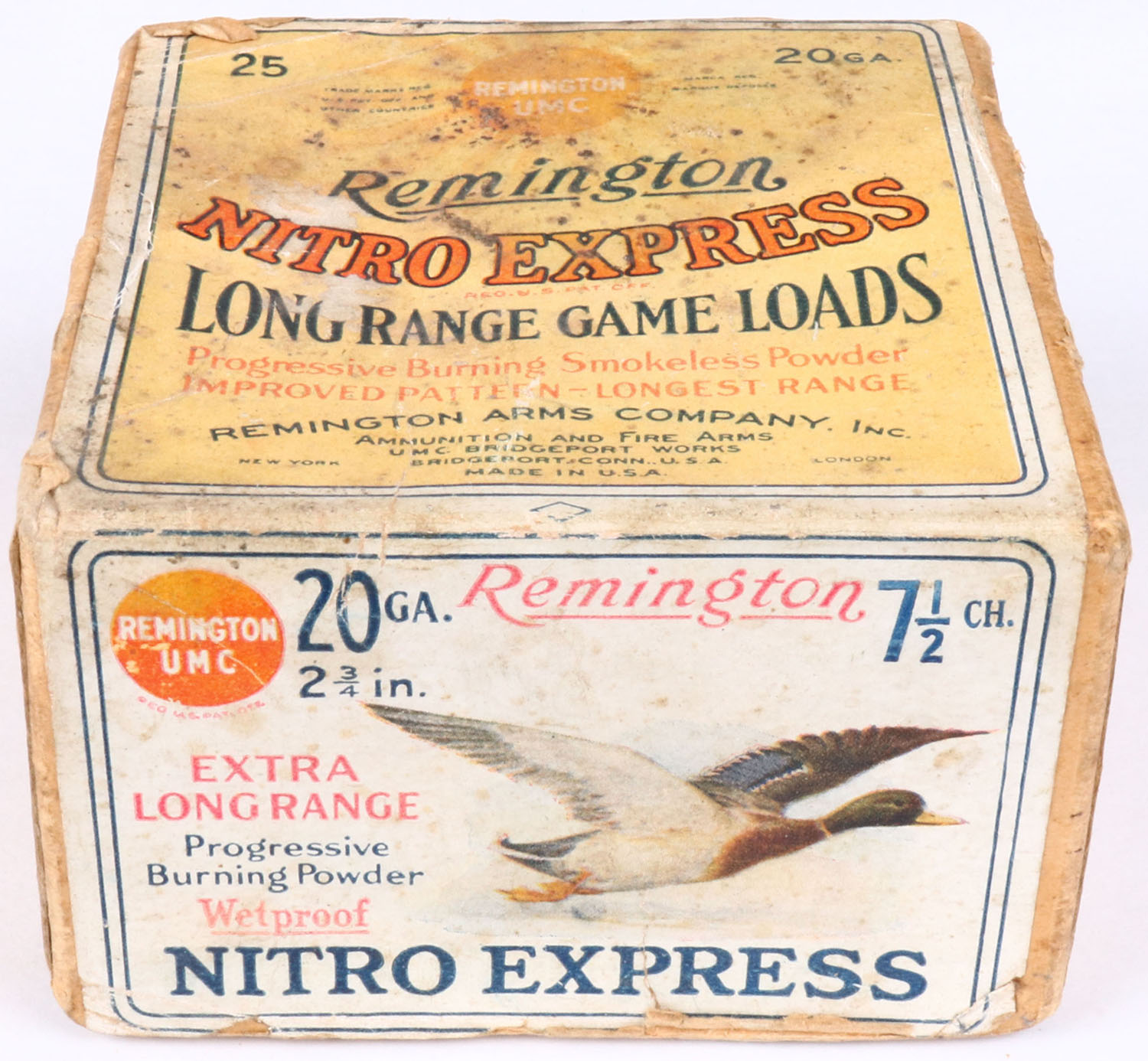 Remington Nitro Express Long Range GAME LOADS, Flying Mallard, 20ga., 2pc., Empty, shot size 7 1/2 CH, buff box with sunburst logo, box has nice label with no bottom label, box is torn with edge wear & age soiling. Grade: Very Good + - Value: 20 to 60