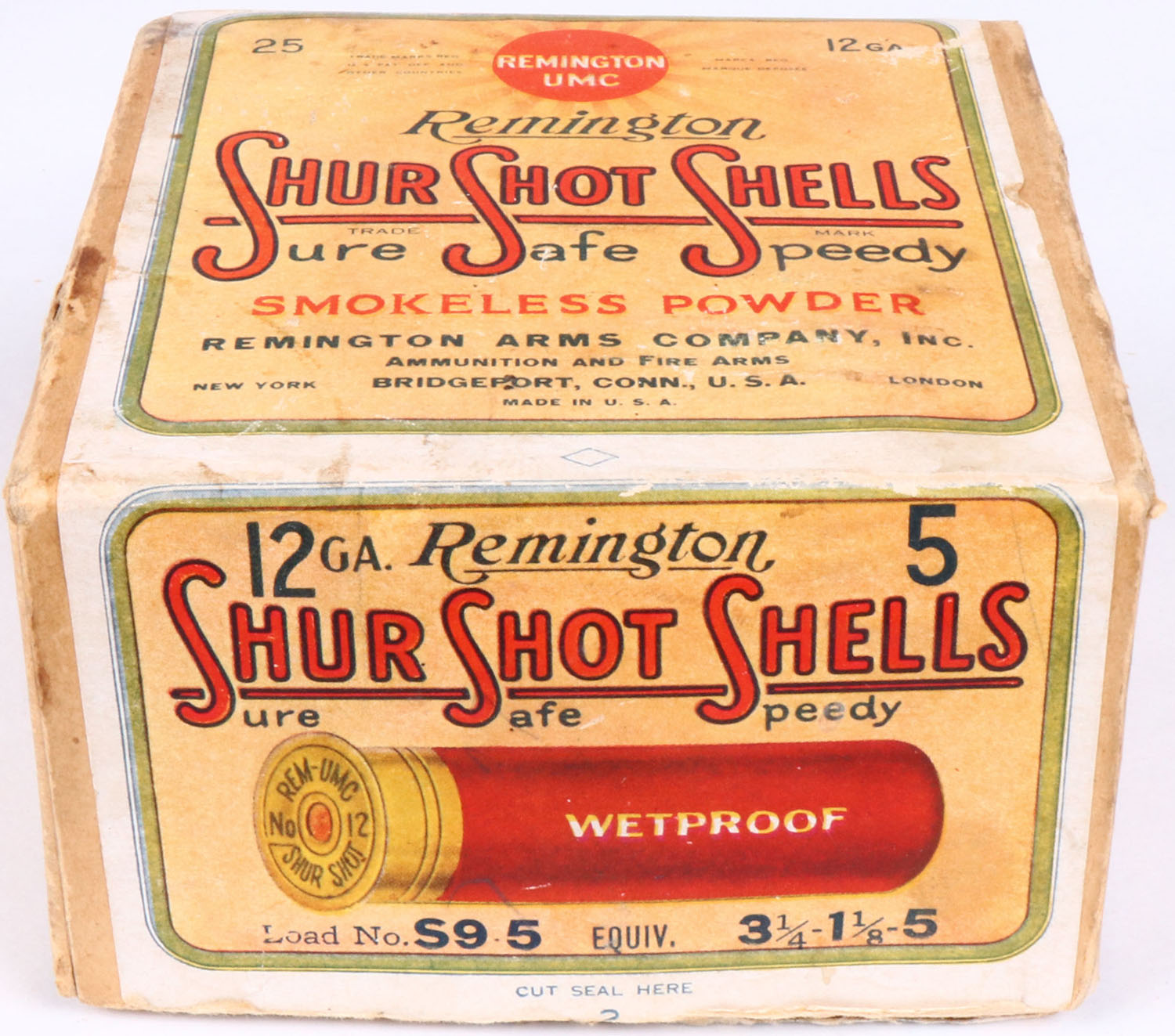 REM UMC, Shur Shot Shells, 12ga., 2pc., Partial 1rd., shot size 5, Buff box with cream & orange paper label, box & label are solid with light age soiling, light edge wear & has very nice color, Shell is very good. Grade: Excellent - Value: 10 to 50