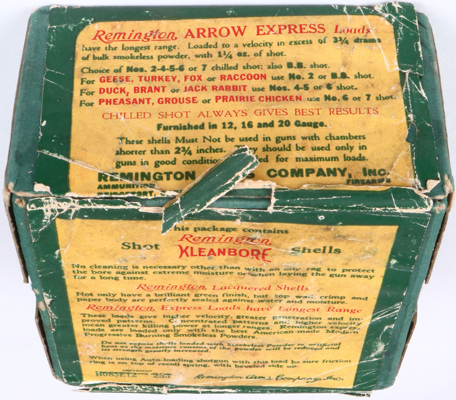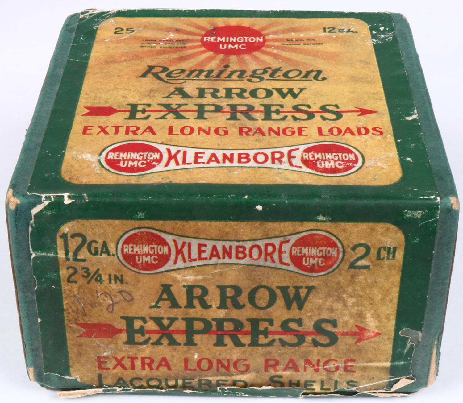 Remington UMC, Arrow Express, 12ga., 2pc., Empty, shot size 2CH, green box with sunburst logo, box has age soiling with nice colors to label. Grade: Very Good ++ - Value: 20 to 80